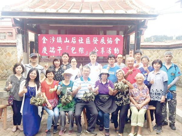 解封新生活,山后飄粽香。山后社區發展協會於今年2月成立,由於受疫情影響活動暫停,鑑於端午節腳步近了,社區透過申請於昨日舉辦「慶端午包粽分享」活動,社區婆婆媽媽忙包粽子,中壯成員協助現場工作,金沙鎮鎮長吳有家也共襄盛舉。居民一同享用美味麵線和粽子,提前共度佳節。 山后社區發展協會於去年6月起在多位熱心的居民奔走下籌備成立社區相關事宜,並在金沙鎮公所協助下突破過去無法解決之限制,順利於去年11月召開籌備大會,在33位創會會員響應下,順利於今年2月成立,為金沙鎮第29個社區發展協會。不過,礙於今年新型冠狀病毒肺炎(COVID-19)疫情影響,社區活動暫停,而無法辦理活動。近期疫情緩和,山后社區發展協會,經過申請,於昨辦理活動,也恰好趕上防疫解封首日。 昨日上午八時許,社區居民齊聚山后梁氏家廟忙進忙出,婆婆媽媽們巧手包粽子,手法相當老練迅速,箇中也不乏男性居民一起包粽,鎮長吳有家也到場參與也小試身手。除了包粽子外,現場亦準備金門道地佳餚麵線,與會貴賓、社區居民,或親子或祖孫或夫妻一同品嚐。接續並由社區中壯成員則協助場地佈置整理和「包粽」分享各家戶事宜,男女少老共聚一堂參與,凝聚情誼,提前慶祝端午佳節。 鎮長吳有家表示,山后社區發展協會的成立,有助於社區透過活動凝聚居民情誼,逢端午佳節也特別到場參與活動,關心社區運作情形、鄉親長輩生活狀況,在粽葉飄香時節,向大家祝賀佳節。 山后社區發展協會理事長梁長傑也說,社區發展協會未成立前,下堡由梁氏宗親會、上堡由民俗文化村基金會董事長王美玉等籌辦活動。經與多位社區居民努力和鎮長及鎮公所協助下,終於在今年順利成立。逢端午佳節先經過申請核備於昨日辦理活動,恰好近期疫情穩定,碰上防疫解封首日,民眾放心參與,也讓這場社區首次活動更加熱鬧。婆婆媽媽到場包粽子,各家戶中壯成員協助場地前、後準備工作,並將社區愛心粽子分送各家戶,關心年長的鄉親,上下團結一心,提前共度端午佳節。