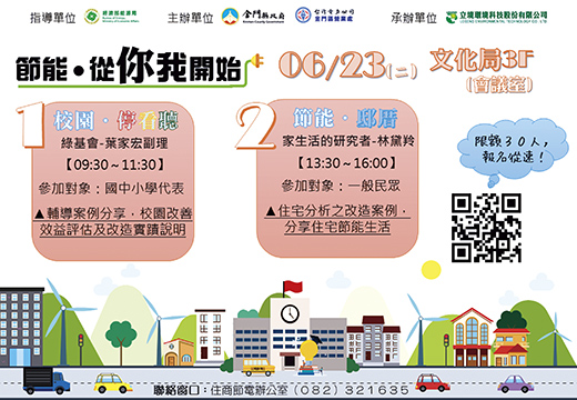 「節能‧從你我開始」系列節能課程,廣受好評再加碼!即日起開始線上報名! 金門縣政府於109年5月25日舉辦「節能‧從你我開始」系列節能課程,參與民眾反映熱烈,好評不斷!將於6月23日於金門縣文化局3樓與台灣電力公司金門區營業處合作,加碼辦理「校園節能‧停看聽」、「節能‧邸厝」共2場次節能課程。 金門縣政府建設處表示,本縣自107年起配合經濟部能源局推動住商節電計畫,為持續落實機關學校節電政策,在積極推動節能改革下,同步兼顧校園設備維護及學童受教品質,營造優良求學環境,因此,特別規劃辦理「校園節能‧停看聽」節能課程,邀請財團法人台灣綠色生產力基金會葉家宏副理,針對校園之潛在能源問題,分析節電最佳可行方案。 另回應民眾熱烈要求,續辦理「節能‧邸厝」節能課程,邀請居家生活的研究者-林黛羚親自授課,針對居家節能節電現身說法,分享豐富的節能經驗。 「校園節能‧停看聽」節能課程上課對象主要為金門縣轄內國中小學,同時歡迎其他機關報名,將針對校園改善效益評估及改造實蹟說明,並輔以二期計畫執行期間輔導之2所校園作為案例分享,期望藉由本次節能課程提供節能分析及建議研析,以鼓勵機關學校進行節能改造。「節能‧邸厝」節能課程上課對象為一般民眾,針對一般住宅環境分享可改造的節電、節能角落!透過改善房屋內動線及循環增加自然通風及採光,另針對屋頂及牆面隔熱材質選用,並結合「環保綠住宅」及「老屋改造」二大主題提供參考案例及實用作法,教民眾如何打造舒適且節能的居家生活環境。 本次活動一律採網路報名,請逕洽https://reurl.cc/Njbvom(2場次節能課程各有30個名額),報名完成後將由節電專案辦公室通知報名成功資訊,活動當天請配合量測體溫及戴口罩進場,並依報名序號至現場完成簽到,節能課程詳細內容可至FB臉書搜尋「金門節能島‧幸福又美好」瞭解詳情。如有任何課程疑問可於週一至週五上班時間(08:00-12:00,13:30-17:30)撥打服務專線:082-321635,將有專人為您說明。