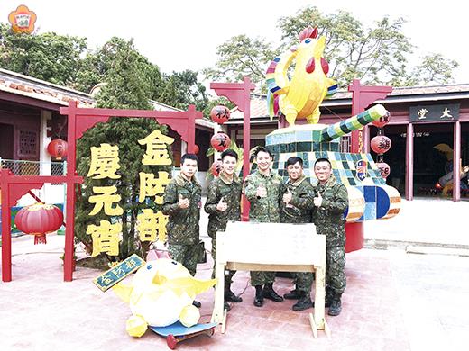 枕戈待旦、聞雞起舞!金門元宵燈會起跑,每年都不缺席的金防部,今(106)年推出「枕戈待旦、聞雞起舞」主題花燈,是一隻雄赳赳氣昂昂的公雞站在一輛彩色的戰車上,精神抖擻,軍民一同慶元宵。 今年金防部花燈主題「枕戈待旦、聞雞起舞」,作品高4公尺、寬2.5公尺,創作理念係結合丁酉「雞」年為主軸,公雞矗立,意寓勉勵官兵積健為雄、聞雞起舞、枕戈待旦,彰顯防區官兵積極戰訓本務的精神。 金防部花燈作者為本部連二兵黃韡昊,畢業於台南應用科技大學美術系,因對美術有濃厚的興趣,同時本身具有民間傳藝歌仔戲、劇場道具製作、書墨等專長。黃韡昊表示,此次花燈製作能結合自身專長感到非常榮幸,希望能透過這個作品,表現出金防部保家衛國的理念,也為軍旅生涯中增添一樁難忘的經驗與回憶。 金防部中將指揮官郝以知表示,為與金門鄉親共同歡度元宵,金防部今年也參與創作大型花燈,希望藉此發揮官兵與民同樂,軍民一心的理念,期望本部與縣府共同建設金門,為金門的未來一同努力。 「愛您一起‧點亮金門」金門106年元宵花燈競賽,於金城鎮總兵署內外廣場璀璨登場,11日近百盞大小花燈吸引各地軍民共同賞燈,為金門帶來熱鬧絢麗的元宵夜。