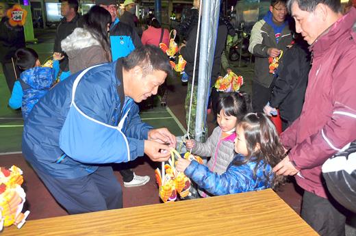 圖文/陳冠霖 金湖鎮昨(10日)晚慶元宵,鎮公所準備限量3000個雞年主題燈籠,由金湖鎮長蔡西湖、金湖鎮代表陳向鑫、謝鴻儒等人,分送給現場鄉親,鎮公所很貼心地幫鄉親把每一個燈籠都事先組裝完成,並裝上電池,讓鄉親一拿到不用回家組裝,當場就可以打開開關讓燈籠亮起,現場到處都是發亮的燈籠,照亮整個新市里籃球場,十分炫麗。據了解,今年除縣政府有發送雞年小提燈外,各鄉鎮僅金湖鎮有發行自製雞年小提燈,也讓這小提燈更加搶手。