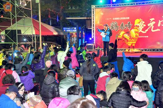 金湖鎮公所昨(10日)晚舉辦「金雞春啼慶元宵」活動,無限量供應爆米花、棉花糖、氣球、紅豆湯圓、金湖鎮特製的金雞小提燈供民眾領取,吸引大批人潮排隊,擠爆山外。許多小朋友也爭相搶答燈謎,答對者可獲得小禮物。 今(11日)天是元宵節,金湖鎮公所昨晚在新市籃球場搶先舉辦「金雞春啼慶元宵」活動,現場無限量供應爆米花、棉花糖、氣球、熱呼呼的紅豆湯圓,以及金湖鎮特製的金雞小提燈,吸引非常多鄉親到現場排隊,人潮擠爆新市籃球場。 排隊的人潮一邊領取食物,主持人也一邊進行元宵節最重要的活動「猜燈謎」,多達180道題目,許多小朋友搶答非常踴躍,主持人題目還沒念完,就有小朋友舉手,答對燈謎者可以獲得鎮公所準備的獎品。鎮公所也邀請去年花蛤小天使賴妍蓁和花蛤季歌唱選手王鴻偉上台表演,將現場氣氛炒熱。昨晚與會來賓包括縣府民政處長陳世保、金湖鎮長蔡西湖、金湖鎮代會主席呂瑞泰、金湖鎮代表陳向鑫、謝鴻儒等人。 縣府民政處長陳世保致詞時表示,縣長陳福海定調今(106)年是行動年,特別瞄準民生、交通、各項建設,務必要做好,陳世保說,金湖鎮團隊的認真打拚,陳縣長都看在眼裡,他祝福金湖鎮鎮運昌隆。 金湖鎮長蔡西湖表示,希望新的一年,各位鄉親揮別過去一年,共同迎接新年,舉辦元宵活動,希望把全金門的人潮都聚集到新市里來,蔡西湖也歡迎鄉親有空就到新市里商圈來走走,並祝福鄉親元宵節快樂。 鎮代會主席呂瑞泰說,元宵節俗稱小過年,他祝福鄉親平安健康快樂,且在蔡鎮長的領導下,今年一定是幸福快樂的一年。
