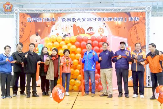 「106年歡樂慶元宵,與可愛玩偶有約」活動,昨日上午九時起熱鬧登場,180組親子報名參加,教育處處長李文良、議員歐陽儀雄、金城代表會主席陳天成等貴賓到場一起手舞足蹈,考驗協調性和體力也炒熱現場氣氛。與會親子分成十隊,彼此在律動及闖關遊戲中拉近距離,並和奶油獅、Q比天使玩偶面對面,小朋友簡直HIGH翻天。此外,活動也以應景短劇表演中介紹元宵節的由來和傳統,透過互動大方贈送禮物,讓大人小孩都歡心。 昨為一年一度元宵佳節,金門縣政府教育處特別規劃辦理「106年歡樂慶元宵,與可愛玩偶有約」活動,吸引180組2-6歲親子報名參加,計有150隊到場參與,不少親子則是現場報名加入,360位親子在活動中展現活力營造美好關係,共度一個溫馨愉快的佳節。 活動自昨日上午九時起登場,並於九時三十分許舉行開幕式,教育處處長李文良、議員歐陽儀雄、教育處副處長陳金文、金城鎮代表會主席陳天成、古城國小校長楊成業、賢庵國小校長楊肅健、安瀾國小校長張志猛、多年國小校長陳來添、正義國小校長許瑞芬、金鼎國小校長蔡雪芳、金寧中小學校長陳雅蘭等到場揭開序幕,並全場親子一起律動,做足暖身也炒熱氣氛。