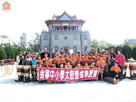 為延續學生鼓藝之精進,金寧中小學辦理106年度寒假太鼓育樂營活動,於二月九日至十二日展開,聘請十鼓擊樂團專業教師入校指導,並於昨日舉行結業式暨成果展演,校長陳雅蘭頒發結訓證書暨票選最佳人氣王獎,鼓勵今年三月參加全國鼓王盃的代表選手,希望在鼓藝上再求精進,相信會有更出色的表現。 金寧中小學國小部於2013年推動成立寧鼓隊,在苦練鼓藝、追求精進過程中,成為該校重點發展的民俗才藝。成立至今不僅在各項校內外展演獲得好評,亦在105學年度全國民俗體育競賽—文陣比賽中,榮獲國中組優等、國小組優等獎的殊榮。 這項寒假太鼓育樂營活動一連展開四天集訓於昨日結業,並假莒光樓前廣場舉行成果展演,展演學生共計31名,演出四套曲目為:《天地人》、《大破連環》、《奔虎》、《乘風破浪》,指導老師是林靜儀,外聘教師:台南十鼓擊樂團涂雅文老師。每首曲目表演完畢,由遊客觀眾家長及親友團在最佳人選身上貼上貼紙,最後統計票選出最佳人氣獎共計五名頒獎。 繼成果展演結束後,為營隊結訓典禮,校長陳雅蘭頒發結訓證書暨遊客觀眾、家長票選出來的最佳人氣王獎,第一名蔡岳勳,第二名許華峻,第三名莊博翔,第四名林加群、楊依蝶,第五名李宜臻。同時頒發感謝獎感謝外聘教師涂雅文老師的指導,並犧牲假期為孩子們搭起表演舞台,給孩子們信心、希望與歡樂,也讓家長們看到孩子們精彩的學習表現。讓孩子在短短的四天集訓營隊活動後,表現這麼令人震撼的鼓藝。陳雅蘭也謝謝學校行政團隊及林靜儀老師的辛勤教導,更要感謝教育處及社區家長的支持。