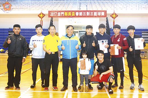 2017「縣長盃」三對三籃球賽在縣立體育館舉行,昨(三)日下午頒獎閉幕,縣府教育處長李文良頒獎表揚績優隊伍時,他鼓勵大家養成運動好習慣,並強調縣府會繼續創造機會,讓更多喜愛運動的朋友,有一個競技的場合,使球技更為精進。 「縣長盃」春節三對三籃球賽於二、三日的下午在縣立體育館舉行,共有社會男子組(含大專)、社會女子組(含大專)、高中男子組、高中女子組、國中男子組、國中女子組等六組四十九隊進行七十二場次的比賽,昨日下午賽程結束後接續舉行摸彩活動,三十位幸運者各得到一顆「金雞蛋」(籃球),隨後並頒獎閉幕,由教育處長李文良主持,縣立體育場場長許換生,以及裁判、工作人員與球員在場參加。 李文良處長也代表縣長陳福海向大家拜年,祝福大家新的一年學業進步、工作順利,並感謝裁判人員執法辛勞,以及體育場與工作人員在年節辦理這項三對三籃球賽,讓年輕的朋友以健康的方式來過年。 他說,春節期間大家以球會友、聯絡感情,勝不驕、敗不餒,這是很好的運動精神,此次沒有得到好成績的隊伍,好好再加油,下次捲土重來,爭取佳績,而縣府也會繼續創造機會,讓更多喜愛運動的朋友,有一個競技的場合,使球技更為精進。 許換生場長指出,此次「縣長盃」三對三籃球賽採網路報名,有些青少年朋友因為報名時間截止沒有辦法參加,體育場會常常舉辦類似的活動,提供運動平台以鼓勵年輕朋友運動鍛鍊身體、健全身心發展。 2016「縣長盃」三對三籃球賽各組績優隊伍並由李文良處長頒發獎狀與獎金,分別為: 社男組:第一名新年快樂。第二名信宏鋼鋁。第三名吉祥。 社女組:第一名312417。第二名金門大學。 高男組:第一名加水站。第二名神雞妙算。第三名農工A。 高女組:第一名沒被打過。第二名農工B。 國男組:第一名四巨頭。第二名野豬騎士來囉。第三名小哈隊。 國女組:第一名城中。第二名城中。第三名城中C。