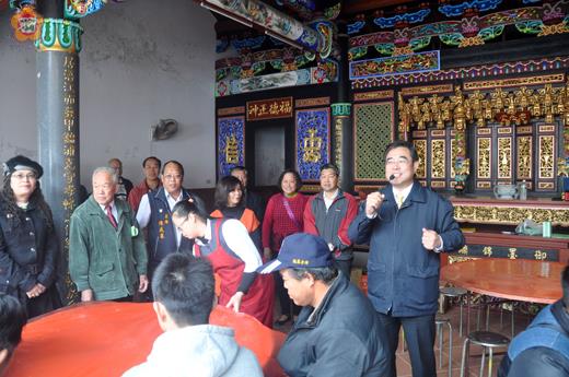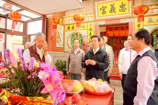 農曆天公生與元宵佳節將屆,塔后忠義宮昨舉行天公醮,縣長陳福海昨日上午率同縣府多位秘書前往拈香致敬,並向廟方獻爐敬金,祈求合境平安、風調雨順。 昨日上午九時三十分許,縣長陳福海與民政處長陳世保、縣府秘書李文俊、李清俊、許金象、陳國民、黃秀珍等人前往廟中上香,受到忠義宮管理委員會與當地鄉親、長老歡迎。 陳福海循古禮儀式上香、獻果、獻饌、獻花、獻金箔等,並獻爐敬金,虔誠祈護地方安樂,同時也祝福廟方晚間舉辦的元宵博餅活動順利成功。 塔后文史工作者陳宗新表示,「忠義廟」的山西夫子與金府千歲的輦轎都是造於民國二年,蓋頂是鐵皮所製、十分工巧,廟方未來將考慮請文化局博物館藏,保存金門廟宇文化資源。 忠義宮鄰近縣長陳福海的祖厝,廟內主祀「山西夫子」關聖帝君,另祀有金府千歲、周倉、關平、「蘇、邱、梁、秦、蔡」等五姓王爺、金王爺、太子爺、碧虎千歲、關太子……等神尊,為塔后鄉親信仰中心。