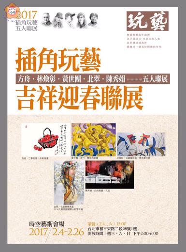 2014年誕生,已然進入第四年的「插角玩藝」,農曆春節再出發! 緊抓住年節的餘溫,「三峽插角工作室」打鐵趁熱,繼2017年伊始,在雅博客、胡思書店展起後,方舟的彩墨、林煥彰的詩畫、黃世團的版畫、陳秀娟的水彩、北翠的油畫,2月4日起又進入「台北時空藝術會場」(台北市和平東路二段28號),5位在不同領域各領風騷的藝術家特別用他們持續創作不輟的熱情,推出「插角玩藝吉祥迎春聯展」。 這項聯展於2月4日下午三點開幕茶會,由時空藝術會場葉樹奎教授、書藝家方舟及報導文學作家楊樹清共同主持。現場金門同鄉、藝文嘉賓雲集,金門縣政府台北服務處主任戴河生亦代表縣長陳福海出席並向大家拜年,詩人向明、方明、張國治、劉梅玉、游淑貞,藝術家霍剛、郭建疆、鐘永和、鄭松維、李水潭、董國生、蔡國烈,台師大文學教授黃慶萱教授、北京大學中文系特聘教授龔鵬程、佛光大學歷史系教授卓克華、唐山書店陳隆昊、資深媒體人陳月卿、前連江(馬祖)縣長楊綏生,金門藝文同鄉顏國民、方素美、孫國欽、孫允理、蔡志堅、楊恭盛(阿盛)等近百人齊聚,除了祝福插角玩藝展出成功,在丁酉年新春金雞報喜的氛圍中,也進行新春團拜。 以金門旅台藝術家陳昆乾、黃世團、楊樹森、陳秀娟、北翠(楊翠華)及台灣著名詩畫家林煥彰等六人為班底,2014年10月成立於新北市三峽山區插角的插角工作室,又作插角藝術學院。三年來歷經不斷的磨合與重組,已為三峽一隅譜寫了獨特又令人讚嘆的人文地景,如今,「玩藝」有成,發起人之一,教育家、書藝家陳昆乾(方舟)也特別在開幕茶會賦詩〈插角頌〉分享藝文同好: 朝陽親吻漂泊者的心靈 溫煦源於大豹溪的流觴 芭蕉 地瓜 芋頭 野菜 鳥語 花香 還有哈哈不斷的笑聲 屬於藝術家的插角 世外桃源 人間天堂