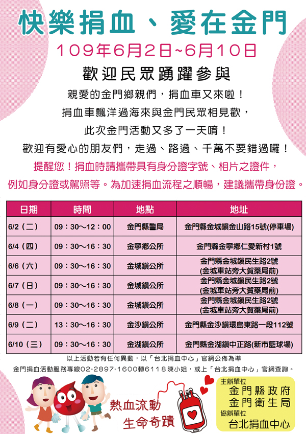 由金門縣政府及台北捐血中心共同舉辦的109年「快樂捐血、愛在金門」活動,6月2日至6月10日將分別在金寧鄉公所、金門縣警察局、金城鎮公所、金湖鎮公所、金沙鎮公所、金門防衛司令部(不對外開放)、金門大學(不對外開放)及金門酒廠(不對外開放)進行,期望金門地區軍民踴躍捐出熱血、傳送愛心,響應「捐血一袋、救人一命」的快樂。 台北捐血中心指出,這次的活動獲得金門縣政府、金門縣衛生局、衛生福利部金門醫院、金門各鄉鎮公所及金門大學等單位鼎力相助。金門地區的軍民千萬不要錯過讓愛心散發的機會,金門捐血活動服務專線02-2897-1600轉6118、0961180865陳小姐,或上「台北捐血中心」官網查詢。 台北捐血中心於民國83年到95年間曾在金門常設捐血站,以固定的捐血車接受軍民捐血;起初效果尚佳,後來駐軍人數一再減少,每天捐血人數不到10人,因此捐血中心在95年撤離金門,改以1年2次或每2年1次派員來金門辦理捐血活動。 本次金門捐血活動還特別增加了一天,期待在新冠肺炎疫情趨緩的當下,喚起地區軍民攘臂捐輸的熱情,為血庫帶來挹注,除了金防部、金門大學及金門酒廠活動不對外開放。