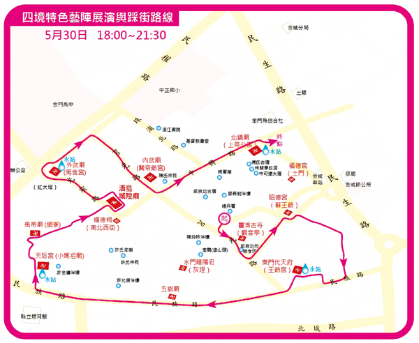 今年閏四月,因此會有兩個農曆四月十二。金城鎮公所將在農曆閏四月十二的前夕,邀請三十組的陣頭齊聚金城後浦小鎮,並且邀請鄉親們一起來夜遊後浦小鎮,大家作伙來熱鬧一番。 每年的農曆四月十二的前一個月開始,金城鎮公所為了要宣傳金門年度的迎城隍宗教盛會,都會舉辦一系列的動態與靜態的「迎城隍觀光文化季系列活動」,但由於今年受到新型冠狀病毒肺炎疫情的影響之下,導致全球各項室內、室外的大型活動悉數停擺,城隍文化季也在四月初宣布停辦,甚至迎城隍繞境也將規模縮小。 金城鎮公所表示,由於新冠病毒肺炎疫情已經逐步趨緩,因此金城鎮公所方面便規劃將在五月三十日(星期六)的晚間六時起,將舉辦「四境陣頭踩街以及民俗表演」活動;踩街隊伍將行經後浦四境主要宮廟以及浯島城隍廟,並帶來各式絢爛繽紛的傳統藝陣演出。 金城鎮公所說明,這場「二○二○金門迎城隍—踩街遊行及民俗表演」活動,預定在五月三十日的晚間六時起至十時之間舉行,屆時將參與踩街活動的隊伍,包括有:東門境將推出「大鼓吹」、「雄鎮堂七爺八爺」、「鑼鼓陣」、「蜈蚣座」、「東門公揹婆」、「蓮花大鼓陣」、「跳鼓陣」、「變臉秀」。西門境則有「轎前鼓」、「跑旱船」、「北管」、「十音」、「鑼鼓」、「金門縣民俗技藝協會公揹婆」。南門境將會有「千順小神將」、「南門布馬陣」、「五月天鑼鼓陣」、「安德宮官將首」、「媽祖會涼傘鼓」、「招財進寶」、「腰鼓隊」。北門境則出動了「舞獅」、「十二婆姐」、「忠義廟三太子」、「昊天官將首」、「鑼鼓」、「神輦」、「武財神」等陣頭組合。另外,在總兵署的現場,則有魁儡戲劇團、金寧中小學大鼓隊進行定點演出。 而當天的踩街隊伍,將會先在總兵署前集合後出發,將會行經貞節牌坊、模範街、縣商會後,由民族路轉往東門代天府,從經民族路前往南門天后宮、禹帝廟、浯島城隍廟、西門外武廟等四境宮廟,之後從莒光路一七一巷繞往莒光路的內武廟、陳氏宗祠,最後在北轉中興路,前往北門境的北鎮廟,另外,參加的陣頭還將於浯島城隍廟以及四境主要廟宇前,進行定點表演。 金城鎮鎮長李誠智表示,為遵守中央疫情指揮中心的各項防疫規則,今年四月十二迎城隍繞境,只有保留傳統的旗、鼓、輦,少了陣頭演出,雖然有反璞歸真的感覺,但在地的陣頭少了大展身手的機會。因此在疫情趨緩之際,也趁著農曆閏四月十二之前,邀請在地陣頭進行踩街表演,把今年四月十二看不到的,一次通通呈現在鄉親面前,歡迎鄉親、遊客們相招逗陣來,感受傳統陣頭的無窮魅力。 李誠智還說,選擇在夜間舉辦陣頭大匯演,不僅少了白天的炎熱高溫,同時也更適合闔家大小、遊客們走出戶外「逗熱烈」;大家可以在涼爽的夜晚欣賞藝陣帶來的精彩演出,並希望藉由這一系列的民俗表演形式,讓「夜遊後浦城」充滿魅力與賣點。