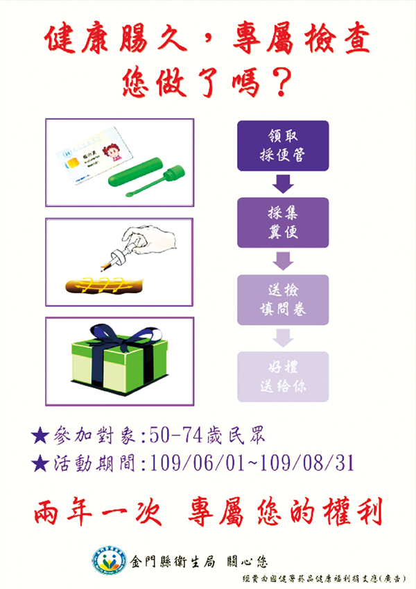 金門縣衛生局舉辦「健康腸久,二年一次,專屬檢查,您做了嗎?」篩檢活動,鼓勵50至74歲民眾,自6月1日至8月31日期間,完成大腸癌篩檢者,即能獲得一份精美小禮物。 衛福部公布107年國人十大死因,癌症蟬聯榜首,因癌症死亡的人數高達4萬8784人,占所有死亡人數28.2%,其中大腸癌好發年齡以50歲至70歲民眾為主,並且為全國癌症死因的第三名。 金門縣衛生局為鼓勵鄉親主動參與篩檢,早期發現異常,把握黃金就醫時機,特辦理109年「健康腸久,二年一次,專屬檢查,您做了嗎?」篩檢活動,凡50至74歲民眾,可接受每2年1次的糞便潛血檢查,本活動自109年6月1日至109年8月31日期間,完成大腸癌篩檢者,即能獲得一份精美小禮物,請帶健保卡到衛生福利部金門醫院或各鄉鎮衛生所,限額前250名接受糞便潛血檢查者可獲精美小禮乙份,提醒尚未接受糞便潛血檢查者,關心自己的健康,還有機會拿禮物,數量有限。 衛生局表示,「健康腸久,二年一次,專屬檢查,您做了嗎?」癌症篩檢活動,於金門醫院、各鄉鎮衛生所各250份小禮,提醒符合篩檢補助條件的民眾,關心自己的健康,還有機會拿禮物,數量有限,發罄不補。 詳細活動相關訊息,請見金門縣衛生局網站及臉書專頁,活動諮詢專線請洽:金門縣衛生局330697-727陳小姐、715黃小姐、衛生福利部金門醫院332546-11948、金城鎮衛生所325059、金湖鎮衛生所336662、金寧鄉衛生所325735、金沙鎮衛生所352854、烈嶼鄉衛生所362078。