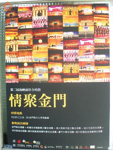 兩岸有史以來規模與人數最大的文化交流活動,「第二屆海峽兩岸合唱節│情聚金門」音樂會,今(十)日晚間七時三十分起,將移師金門縣文化局演藝廳登場,以歌會友,情聚金門。歡迎大家踴躍前往欣賞,共襄盛舉。 由台中市政府、中國音樂家協會、福州市人民政府、金門縣政府共同主辦,財團法人台北藝術家文教推廣基金會、紅柿子數位影音股份有限公司等承辦的第二屆海峽兩岸合唱節,於十一月四日展開為期一週的台灣、金門比賽、交流演出活動。 負責總策劃的台北藝術家合唱團藝術總監郭孟雍表示,去年台灣、金門合唱團隊到對岸參加「福州首屆合唱節-放歌海西」活動,體驗了藝術與人文合而為一的濃濃人情味。因此,今年在延續感動的同時,努力促成第二屆合唱盛事的舉辦,並協商在充滿都會魅力的台中市,以及人文薈萃的金門縣,進行這一場兩岸藝文盛事。事實上,這也是兩岸有史以來規模與人數最大的文化交流活動。 第二屆海峽兩岸合唱節在台中之活動,邀請大陸九個、台灣八個,共十七個合唱團隊合計一千人參加台中縣屯區藝文中心舉辦,逾千人之合唱交流盛會。歷經兩天的比賽,金獎由深圳音協合唱團、廈門大學合唱團、新疆全球通會員之聲合唱團、福州長樂市愛之聲合唱團、河南鄭州師範高等專科學校合唱團及新竹市立混聲合唱團獲得,另有六支隊伍獲得銀獎,及四支隊伍獲得銅獎。 除了比賽之外,十一月六日晚上於台中市圓滿劇場舉行戶外演出,各個合唱團隊以精彩曲目接力演出,獲得現場上千位觀眾的熱烈掌聲及迴響;十一月七日下午三時則於台中縣屯區藝文中心舉辦頒獎音樂會,各團隊以優美動人之歌聲,征服與會的每位貴賓,並在兩岸團隊合唱「快樂的聚會」中掀起第一波高潮,最後以大會主題曲「是愛,把希望打開」結尾,現場台上台下同聲齊唱,在一片溫馨和諧氣氛中,為本次海峽兩岸合唱節留下一次完美的記憶。 金門是演出團隊最期待的地方,為饗金門音樂愛好朋友,今(十)日四百餘人合唱團隊將移師金門,晚間七時三十分,包括深圳音樂家協會合唱團、廈門大學合唱團、新疆全球通會員之聲合唱團、福州長樂市愛之聲合唱團、河南鄭州師範高等專科學校合唱團、廣西藝術學院壯族大歌合唱團、福州市教師合唱團及金門縣合唱團等共八支隊伍,將在金門縣文化局演藝廳盛大開唱,金門縣合唱團亦將以地主身份,熱情參與歡唱,活動精彩可期,歡迎大家踴躍前往欣賞,共襄盛舉!