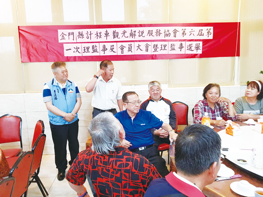 金門縣計程車觀光解說服務協會近日舉辦第6屆會員大會,由蕭天民接掌理事長,完整幹部名單包括:理事陳春成、陳錦珠、洪國利、鄭振勝、翁敏惠、陳清淼,常務理事李天生、何明麗,常務監事蔡龍鳳,監事王美廣、黃美麗,會計陳秀琴、出納陳碧霜、秘書洪彩真、總幹事陳森照。創會理事長為李文良,榮譽理事長翁志能。 金門縣計程車觀光解說服務協會第6屆理事長蕭天民表示,金門縣計程車觀光解說服務叫車專線0911627632,收費以小時計,每小時400元,最低以半日計,8小時酌收3000元,6人座以上每日4000至4500元,歡迎遊客多加利用。