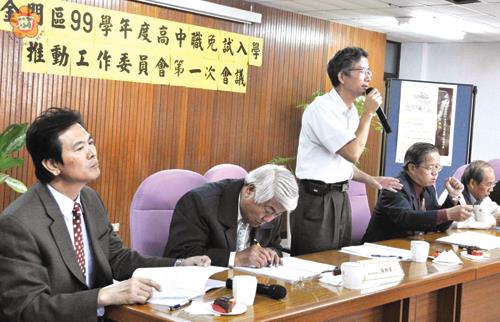 明年(九十九年),金門縣將開始實施高中、高職免試入學。 民國九十九年,全縣各國中將有七十二個名額可以申請免試入學,升讀金門高中;有一百三十二個名額可以免試入學,升讀金門農工。 「金門區99學年度高中職免試入學實施計畫(草案)」昨天由金門區99學年度高中職免試入學推動工作委員會在金門農工開會通過。 根據「金門區99學年度高中職免試入學實施計畫(草案)」,國立金門高級中學將提供七十二個名額給金門區各國中,讓學生申請免試入學,這一入學方式佔該校招生百分比的兩成一八(21.80%);國立金門農工職業學校將提供一百三十二個名額給金門區各國中,讓學生申請免試入學,這一入學方式佔該校招生百分比的三成七五(37.50%)。 金門高中提供的名額分配如下:金城國中三十個名額、金湖國中十八個名額、金沙國中十二個名額、金寧中小學六個名額、烈嶼國中六個名額。 金門農工提供免試入學的名額是國中每兩班十一個名額;各國中可分配的名額如下:金城國中五十五個名額、金湖國中三十三個名額、金沙國中二十二個名額、金寧中小學十一個名額、烈嶼國中十一個名額。國中申請的截止日期為九十九年三月十七日。 金門區99學年度高中職免試入學推動工作委員會於昨天召開第一次會議,會議是由教育部中部辦公室副主任黃新發主持;出席者還包括:第三科視察徐賜珍、中辦室督學陳華樹、金門農工校長陳水芳、金門高中校長蔡錦杉、金門縣政府教育局長李再杭、金門農工教務主任劉湘金、組長吳振堂、金沙國中校長何莉莉、金湖國中校長吳啟騰、金寧中小學校長許維民、金城國中校長楊瑞松、烈嶼國中校長宋文章等,另有教師代表及家長代表。 根據會中通過的「金門區99學年度高中職免試入學實施計畫(草案)」中,實施免試入學的目的包括:一、發展學生多元智能,紓緩學生升學考試壓力。二、發揮教師教學專業能力,提高教學與學習品質。三、發展學校辦學特色,增進學生適性學習與發展。四、全面關照不同地區學生,縮短城鄉教育落差。 根據實施計畫中的相關規定,金門高中、金門農工所提供的名額,申請對象是以金門地區國中應屆畢業生為限。九十九年各國中申請免試入學的學生,以採計應屆畢業學生二上至三上三學期成績總平均,以七大領域計算,且申請者在此三學期期間,必須全程均就讀該校。各校應就學生報名資料,採書面審查方式辦理,不得再辦理任何形式的測驗。 金門區99學年度高中職免試入學的重要日程包括:九十八年十一月二日(昨天)召開金門區99學年度高中職免試入學推動工作委員會召開第一次會議;十二月十一日召開第二次會議。九十八年十一月十一日招生委員會召開第一次會議;十一月二十五日召開第二次會議。九十八年十二月三十一日登記購買簡章;九十九年一月十五日公告招生簡章。九十九年三月十六日、三月十七日集體報名│報名地點為國立金門高級農工職業學校。九十九年三月十九日招生學校領取報名表。九十九年三月二十四日各校放榜。 各國中每位學生僅可申請一所高中職學校報名,不得同時報名兩所學校。金門高中限選一志願;金門農工限選三志願。