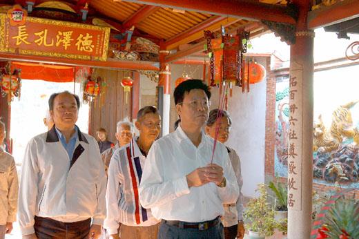 金門地區啟建第三次兩岸和平消災祈福超薦水陸大法會,於日前圓滿落幕。縣長李炷烽昨日親迎駐駕於法會會場的「恩主公」陳淵金身回返庵前村牧馬侯祠,李縣長再度上香感謝「恩主公」的護佑,讓法會圓滿功德。 今年為古寧頭戰役60週年,金門繼93年6月間、95年10月間之後,第三次舉辦兩岸和平消災祈福超薦水陸大法會,法會於上月24日晚上7時在縣立體育館舉行的點燈祈福儀式揭開序幕,展開為期8天的活動,籌委會除了迎請佛教菩薩外,也迎奉1200年前開拓金門的「恩主公」牧馬侯陳淵金身駐駕於法會會場。 縣長李炷烽以法會籌委會主任委員身分,於法會前夕迎奉「恩主公」陳淵金身駐駕於法會會場,佛道共同為兩岸和平祈福。 在法會於上月三十一日圓滿落幕後,昨日,縣長李炷烽由縣府民政局長洪國正等人陪同,親迎「恩主公」牧馬侯陳淵金身坐上神輿,手捧神印,在地方長老的陪同護持以及古樂聲中,回返牧馬侯祠。李縣長再度遵循古禮行上香、獻果等祭禮,感謝「恩主公」和眾神明以及菩薩的護佑,讓法會圓滿功德,超薦歷代戰亂的亡魂,祈祝兩岸永止干戈,世界共享和平。