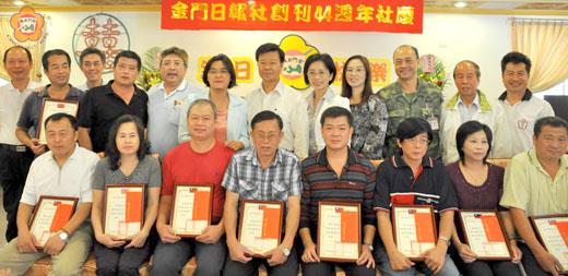 中華民國五十四年,《金門日報》在十月三十一日創刊;今天正是《金門日報》的四十四歲生日。《金門日報》的生日願望就是:希望有金門人的地方,就有《金門日報》! 金門日報社的全體人員和各界人士,昨天為《金門日報》慶生,祝福「四四順利」(事事順利)、「四四如意」(事事如意)。 《金門日報》的前身是《無邪報》,後改為《正氣中華報》;《正氣中華報》與《金門日報》曾以雙子報的方式同時發行。金門日報社社長黃雅芬表示,《金門日報》創刊已經四十四年,若加上《正氣中華報》的時代,實際已有六十歲;黃雅芬期許有金門人的地方,就有《金門日報》! 黃雅芬表示,《金門日報》是金門的資產;這麼多年來,《金門日報》之所以能夠屹立不搖,是因為有政府及各界的支持和指導。未來,金門日報社將繼續以專業和熱情,編製優質的報紙。在《金門日報》四十四歲前一日(昨天),社長黃雅芬、經理方天吉、印刷廠廠長李金溝、會計主任梁惠綾、人事管理員陳慧美等,領銜與各部門的同仁登上太武山,為報社的永續經營健行。 在昨天中午的慶生會,出席賓客有金門縣長李炷烽、金門縣議員蔡水游、陳玉珍、國立金門技術學院學務長董燊、金防部政戰副主任陳忠文上校、名城有線電視董事長許雪芳、縣府教育局長李再杭、行政室課長傅仰土、社會局長許乃權、畜試所所長陳世保、林務所所長葉媚媚、農試所所長胡錫載、防疫所所長莊謙恭、車船處處長許一傑等。 藝術工作者吳宗陵、作家陳延宗、《金門日報》鄉訊版主編楊樹清等,也參加了這場聚會。吳宗陵贈了一幅字給金門日報,其中有「日服萬民」的字樣。 李炷烽對金門日報社八年來的共事表示感恩;他期許《金門日報》除了支持政府政策外,還要有多元及批評的功能。 蔡水游認為《金門日報》已經是一份中立、客觀的報紙;陳玉珍表示,她不能一天不看《金門日報》,即使是求學時代,在網路還不方便時,雖然身處國外,都會想要看《金門日報》;她認為這是一份能讓人看到家鄉的偉大報紙;她在《金門日報》四十四歲的慶生會中,祝福《金門日報》:「四四如意、四四順利」。 董燊表示,他可以在新加坡的僑社看到《金門日報》,可以在峇里島連上《金門日報》的網站,還可以在金門各家「7-11」(便利商店)看到《金門日報》-這就代表《金門日報》的影響力。 行政室課長傅仰土曾歷練過金門日報社的採訪主任及總編輯;他在社慶活動中回報社,二話不說,乾一杯表示祝福。金門日報社現任總編輯是鄭大行,採訪主任是翁碧蓮。 退休的老員工黃以義、傅永泰、翁啟振、張清木、歐陽可進、蕭宗民、翁水相、楊皆再、陳振聲等,昨天也參加聚會,敬敬往日同事,並與縣長、社長一起切生日蛋糕。 在慶祝大會中,金門日報社表揚了服務滿四十年、三十五、三十年及二十五的資深員工。服務屆滿四十年的人有陳進和、楊肅裕;服務屆滿三十五年的有陳麗明;服務屆滿三十年的人有楊炳氣、吳火來、陳再生、盧清叻、鍾永盛、楊添壽、陳志生、李惠娥;服務屆滿二十五年的人有蕭志清及本社社長黃雅芬。 陳進和祝福《金門日報》永續經營;陳麗明以「愛在報社」表達對這份工作的情感。還有人說:三十年了,酸甜苦辣都有,重要的是「惜情」!金門日報社產業工會常務理事王根圍則祝福報社「社運昌隆」。 走過四十四年,《金門日報》做為一份地方報或社區報,不論是新聞、廣告,還是副刊,都讓金門民眾擁有接近與使用的機會,這是《金門日報》的一大特色。《金門日報》未來努力的方向包括:「積極充實新聞內涵,強化副刊、專刊功能與特色,契合民眾知的需求與權益,融合社教目標,增進文化生活品質。」「深度報導國際、國內及地區重大新聞事件,並適時評論,善盡媒體責任。」