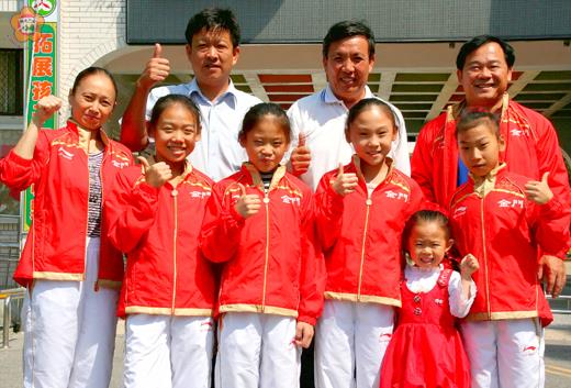 九十八年全國運動會明開幕,金門今年首度參加競技體操項目,代表隊提前赴台準備,楊鈺婷、葉品嶸、蔡宜妮、劉曉芸四位選手是地區土生土長的小美女,她們在教練梁萍的帶領下,昨日搭機前往台中做最後衝刺,以期為金門爭取最高榮譽。梁教練說,場上瞬息萬變,臨場穩定度成為關鍵,期許選手拿出水平,贏得佳績。 金湖國小女子體操隊於九十二年成軍,隨後即在全國競技體操錦標賽屢獲佳績,當年初試啼聲即拿下國小低年級女生組成隊冠軍,贏得好彩頭;九十三年再次蟬聯冠軍寶座;九十四年退居第二;九十五年則第三度拿下全國競技體操錦標賽國小低年級女子組成隊第一名。 一年一度的全國競技體操錦標賽是分齡制,金門地區自九十二年起參加國小低年級女生組,九十六年起選手經過四年的磨練,技巧漸成熟跨出第一步參與更高一層級的國小中年級女子組賽事,並拿下成隊第二名之成績;在九十七年全國競技體操錦標賽中,一舉拿下國小中年級組成隊冠軍,金門體操往更上一階段邁進,更讓支持體操發展的各界看見了不可能。 這群翻滾女孩們,忍著全身上下青一塊紫一塊的傷以及手中厚厚的繭拚命練習,今年她們要代表金門地區參加九十八年全國運動會,這是金門有史以來首次參加該項賽事,在全國殿堂中,對平均年齡僅十二歲的她們而言是一項考驗,不過,劉曉芸、葉品嶸、楊鈺婷、蔡宜妮她們從國小低年級時就開始訓練,現在已是高年級,技巧較以往純熟、比賽經驗也不在話下,體壇十分看好她們能為金門奪牌。 九十八年全國運動會即將於十月二十四日起至十月二十九日止,假台中市舉行,金門地區代表隊將於二十四日啟程赴台參賽。為適應場地,盡早熟悉比賽節奏,女子競技體操代表隊昨日提前出征,二十六日起將連續三天出賽。 昨日包括湖小校長張木百樾、家長會會長林長鴻等也獻上祝福,替小選手加油打氣,希望她們能夠為金門爭光。而梁教練說,選手目前練習狀況良好,不過場上瞬息萬變,選手的臨場表現和穩定度將是關鍵,故提前前往比賽場館熟悉環境,希望他們拿出平常練習水平,贏得佳績。