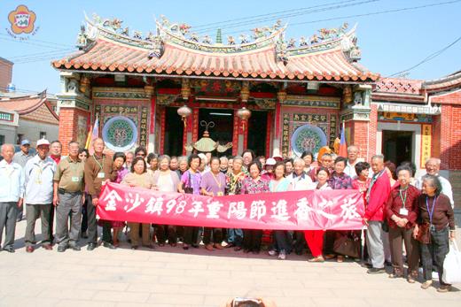迎接一年一度重陽節到來!金沙鎮昨天舉辦98年重陽節進香之旅,吸引來自各村里的阿公阿婆參加,在鎮公所人員陪同下,搭車前往轄區各廟宇拜拜、祈福,提前渡過一個快樂的重陽佳節。 金沙鎮98年重陽節進香之旅活動,昨天上午八時三十分起展開,這次參加的老人只要設籍金沙鎮、年齡六十五歲以上老人(行動自如,且無嚴重性高血壓、心臟病者),均可報名,總共有三百人參加。 鎮公所社會課表示,為慶祝一年一度老人節,在重陽節前夕邀請金沙轄區內老人,至鎮內各寺廟進香及從事健行郊遊,除倡導正當之戶外活動,也藉此促進老人身心健康、快樂。 金沙鎮阿公阿婆重陽節進香之旅,他們前往了田浦東嶽廟、山西北嶽廟、田墩(泰山)西嶽廟、鶯山廟(六甲西宮)、沙美萬安堂等宮廟進香、祈福;同時,鎮公所也為參加活動老人及工作人員投保公共意外責任險。 中午,參加進香的阿公阿婆並在陽宅會餐聯誼,增進老人情誼;金沙鎮重陽節進香之旅至下午二時三十分,始告一段落,促進老人身心健康,也提前渡過一個愉快的重陽佳節。