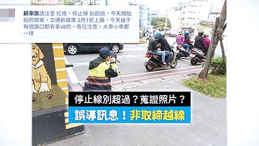 你最近LINE 收到這張圖片嗎?近日LINE持續流傳一張照片,描述「今天開始拍照開單」、「交通新政策 2月1號上路」、「騎車族請注意!紅燈,停止線別超過……」的謠言訊息,畫面則是一員警蹲著拍照蒐證的情形。事實上在109年2月1日並沒有類似交通新政策,縣警局表示,該執勤項目並非取締越線,還是呼籲民眾遵守交通規則,也可以避免遭取締讓荷包失血。 近日金門地區有民眾於LINE群組收到「今天開始拍照開單,交通新政策2月1號上路,騎車族請注意紅燈,停止線別超過,今天幾乎每個路口都有拿V8的,各位注意,大車小車都一樣!」的圖片。經電詢交通隊後獲悉,實際上近期並沒有這樣新的交通政策,這是看圖說故事的謠言訊息;該圖僅係新北市政府警察局板橋分局於捷運府中站拍攝一般交通宣導影片現場,非拍攝取締越線行為,請民眾勿一傳再傳,避免因傳遞假訊息而觸法。 警方表示,警察平時執勤項目包含蒐證、舉發違規項目均依照相關法令執行。雖然「道路交通管理處罰條例」第7-2條,用科學儀器取證、逕行舉發的項目,並沒有包括「跨越停止線」。但是用路民眾仍然不可將車停放於停止線或行人穿越線(俗稱的斑馬線),因為停等紅燈時超越停止線或斑馬線,的確違反「道路交通管理處罰條例」第60條第2項第3款「汽車駕駛人不遵守道路交通標誌、標線、號誌指示」規定,可處新臺幣900元以上1,800元以下罰鍰。 縣警局也再次提醒地區民眾,依照108年10月1日的交通新制規定,若在斑馬線上堆積、置放物品妨礙交通,或在斑馬線旁燃燒物品,導致濃煙影響行車視線,都可開罰3,000元至6,000元罰鍰,若因此使人受傷或死亡,將加倍處罰。所以建議大家真的要遵守相關交通安全規定,其實除了省掉罰單之外,同時也是保障自己和他人的安全。