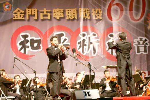 紀念古寧頭戰役60周年的「古寧頭和平祈福音樂會」,昨晚假縣立體育場引爆,大提琴家張正傑、台北市立交響樂團及女高音林惠珍等多位知名音樂家,用無形的音符,緬懷當年參戰軍民的英勇與犧牲奉獻,祈福化干戈。福建省政府主席薛承泰、金門縣長李炷烽也和觀眾一起聆聽這一場精湛的音樂饗宴。 10月25日為金門古寧頭戰役60週年紀念日,為紀念這場讓台灣轉危為安的戰役,金門國家公園管理處於昨日起一連兩天舉辦和平祈福音樂會。首場為戶外大型演奏會,於昨晚七時在縣立體育場的廣場舉行,由國內樂壇知名大提琴家張正傑和國內大型音樂團體台北市立交響樂團及女高音林惠珍、小提琴家姜智譯、笛子演奏家吳宗憲等多位知名音樂家擔綱演出。 這一場戶外音樂會,是地區難得一見的大規模音樂會,大型的戶外舞台和精心設計的絢麗燈光,也帶給現場觀眾耳目一新的體驗。福建省政府主席薛承泰、金門縣長李炷烽、金防部政戰主任黃慶靈、營建署副署長許文龍以及本報社長黃雅芬等來賓和眾多的觀眾一起欣賞,受到金管處處長曾偉宏和團隊人員的歡迎。 曾偉宏指出,在古寧頭戰役屆滿六十週年的此刻,且讓音樂家以無形的音符乘載著我們穿越時空,照亮歷史的軌跡,為在此戰役中成為英雄的官兵與民眾,進行追思與祈福,並在音樂中思考生命與表達追求和平的決心。 台北市立交響樂團以「比才/卡門前奏曲」揭開序幕,在國立台灣師範大學音樂系專任教授廖嘉弘的深厚藝術內涵指揮下,團員焠鍊出最美的和諧樂聲,風靡觀眾。主持人張正傑、張瑞玲說,在美好的夜晚、美好的氣氛以及最好的交響樂團,所帶來的音樂會,有特殊的紀念意義性,張正傑說,戰爭與和平,追求的是和平。 張正傑說,第一首是比才作曲家所寫的「卡門前奏曲」,卡門最有名的是鬥牛士之歌,今年是牛年,六十年前的古寧頭戰役也是牛年,特別以這首曲目來為活動揭幕。 整場音樂會,為觀眾帶來最適合展現出古寧頭戰役的曲目「孟德爾頌/芬加爾岩洞序曲」(獨奏:鄧詩屏)、「海頓/小號協奏曲」、「德弗札克/大提琴協奏曲第二樂章」(獨奏:張正傑)、「威爾第/歌劇茶花女選曲:真是奇妙!」(獨唱:林惠珍)、「艾爾加/第一號威風」、「柴可夫斯基/1812序曲」,讓聽眾沉浸在這些國際音樂大師的作品樂曲中,並從中感受體會不同的生命樂章,也體驗大型的戶外音樂饗宴,觀眾大呼過癮。 第二場則是在翟山坑道內,今(18)日上午10時30分,除了張正傑大提琴演出外,還有女高音林惠珍、笛子演奏家吳宗憲、小提琴家姜智譯、豎琴家洪綺鎂等人共同演出。表演時,所有表演人員乘坐在活動舞臺上,以環繞坑道方式來進行演奏,讓戰役遺蹟透過時空轉換角色,重新闡釋和平的可貴。