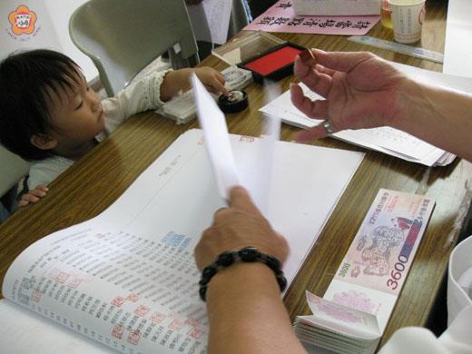 三千六,換保險! 金門縣政府和金酒公司的三千六百元感恩回饋券於昨天進行第二階段的發放。圖中小朋友的母親說,回饋券來得正及時,可以折現付孩子的保險費。 還有一位金湖地區的女性表示,把回饋券留到中秋節後才保值,若在中秋節前,早就花光光了。