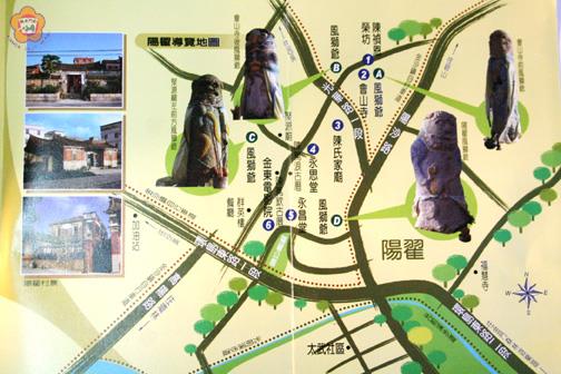 一張專門介紹金沙鎮陽翟人文歷史及風景景點的「陽翟導覽地圖」出版了,印刷十分精美,且圖文並茂,只要一張在手,就可以踏著輕快的腳步,走訪陳禎恩榮坊等各處景點,盡收美景,以及對會山寺四座「金門守護神~風獅爺」做一次深度的探訪,完成一趟感性又知性的地方采風之旅。 「陽翟導覽地圖」(見圖)一張A4紙張大小,正反面印刷,採摺頁式,介紹陳禎恩榮坊、會山寺、陳氏家廟、永思堂、永昌堂、金東戲院,以及會山寺前、右後方、左前方等處的四座風獅爺,各有不同的功效,有防水煞、防風煞、防箭煞等的主要任務,一張在手,按圖索驥,相信收穫會很多,且驚奇不已! 陽翟是金門縣東南隅的一個純樸、寧靜的農商社區,俗稱「浯陽」,也就是傳說中的「柯宅」!它坐東南朝西北,東接鯉魚湖(東店湖,為陽翟所有),南朝七重峰(太武山),北臨西吳,西與後水頭為界。浯陽子軒工作室陳瑋欣表示,若以地理風水來看:右擒「五虎」,左擁「太武」,身坐「玉鯉」,面朝「鳳漸」的火舌地。 「陽翟導覽地圖」記載:五代-後梁時,有位卜卦先生說:「羊吃瓜」,因此命名為「柯宅」。五代梁乾化九年(公元九一三)時,金門浯陽始祖陳達(898—993年)原籍河南光州固始陽翟村,受王審知封為承事郎,奉命震管浯洲鹽場,卜居地仍曰陽翟,開基繁衍。其長子陳洪濟(五代末同安縣令)創「浯陽」堂號,其弟洪銛分居後行創「浯江」堂號。 陳瑋欣說,至六世金門陳氏人口居浯之半,乃分立「仁、義、禮、智、信」五房,於宋乾道元年(1165年)建五恆堂。到了日據時代,日本政府到此地時,才更名為「洋宅」,當時人民雖然非常憤怒,但也對日本政府無輒,到最後百姓也慢慢適應了。 陳瑋欣表示,一直日軍撤退之後,國民政府覺得「洋」字,好像有日本統治的影子,才將「洋宅」更名為「陽宅」。直到民國八十五年參加同安陽翟陳氏宗祠奠安大典,無意中看到族譜寫著「陽翟」陳氏族譜,詢問當地宗親才知道村名因同音而被誤寫。於隔年村里民大會宗親提案將更村名「陽宅」更正為「陽翟」,業經金沙鎮公所函轉金門縣政府審查,終於於八十七年元月核定村名更正為「陽翟」。