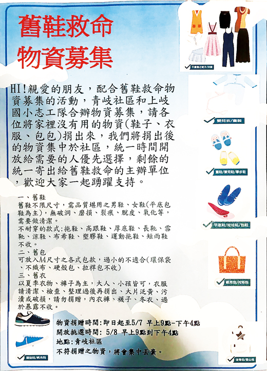 舊鞋救命 青岐社區上岐國小發起物資募集活動 歡迎支持