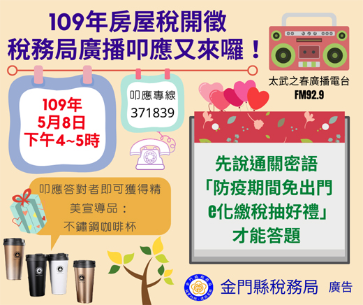 金門縣稅務局因應109年房屋稅開徵及行動支付或網路繳稅抽獎活動宣導,今(8)日下午4時至5時將在太武之春廣播電台,廣播調頻FM92.9,辦理廣播叩應,開放電話:371839,該局備有20份不鏽鋼咖啡杯精美宣導品,歡迎鄉親屆時收聽叩應得好禮。 稅務局表示,109年度房屋稅繳款書已寄出,如未收到稅單或遺失,徵期內(即5月31日前)可逕向全國各縣市地方稅務局(處)全功能櫃台,或飛躍稅務通跨區服務,均可辦理全國跨區補發當期繳款書,歡迎民眾多加利用,如有疑問也可撥打該局服務電話:(082)325197洽詢。 稅務局指出,為推廣行動支付及網路繳稅,鄉親以行動支付或網路繳納房屋稅還可抽好禮,在109年房屋稅開徵期內(5月1日至31日),以行動支付或網路繳納金門縣開徵的繳款書(稅單),就可參加抽獎活動。 行動支付方式有二,一是下載以開辦「行動支付工具」繳稅業者之APP「台灣行動支付(台灣Pay)、ezPay簡單付、i繳費及各行動網銀App介接台灣Pay」;二是在金門監理站及稅務局,持稅單臨櫃以行動支付感應或信用卡刷卡繳稅。 網路繳稅方式則是透過網際網路連結網路繳稅服務站(https://paytax.nat.gov.tw)或掃描稅單上QR-Code,也可連結至網路繳稅服務網站,就可以信用卡、活期(儲蓄)存款帳戶或晶片金融卡繳稅,詳細繳納步驟稅務局網站活動專區也有詳細說明。 稅務局表示,今年的獎品有好禮一、600元賣場禮券共15份;好禮二、3,600元賣場禮券1份,名額增加5份,最高獎金由3,000元提高至3,600元,每人中獎以1次為限,獎項從優獲得,預計109年6月底前在公正人士見證下,辦理抽獎,希望鄉親把握機會。 另5月8日廣播叩應答題者限金門地區聽眾,要先說通關密語「防疫期間免出門e化繳稅抽好禮」才能答題,每一人及每一電話號碼限領取一份宣導品,領獎請持國民身分證正本或戶口名簿正本(經核對無誤後當場發還)及私章,於上班時間向太武之春廣播電台洽領,地址在金門縣金寧鄉伯玉路一段240巷9號,領獎期限自109年5月11日至6月10日止,逾期未領獎者一律視為棄權不再受理。 稅務局預先披露叩應宣導題目,內容如后: 1.109年房屋稅的開徵期間是什麼時候?2.金門縣稅務局109年清查「農業區」、「保護區」之哪種地目土地,就符合申請改課田賦,主動辦理改課「田賦」,達到免徵「地價稅」?3.109年房屋稅的課稅期間是什麼時候?4.109年幾月幾日起由國稅局、縣府建設處及稅務局共同推動「工商、稅捐一站式服務」,提供金門縣商業登記、稅籍登記及娛樂業代徵娛樂稅一站式服務?5.房屋稅的計算式是面積*標準單價*地段率*稅率*課稅月數=年度應納房屋稅,那決定房屋稅高低的三大基礎是什麼?6.娛樂稅之代徵人為娛樂場所、娛樂設施或娛樂活動之提供人或舉辦人,屬娛樂業類別請說出3種?7.違章房屋要不要課徵房屋稅?8.文化局與稅務局共同推出「您借書稅務局送贈品」,舊讀者(在5月1日前辦證者)於109年5月4日起一次借滿幾本書,可獲贈贈品提領券一份(限量640份),送完為止?9.認定住家用房屋屬自住的3條件是什麼?10.要使用哪2種方式繳納109年房屋稅,才可參加金門縣稅務局抽獎活動?11.房屋供作營業使用,但沒有取得營利事業執照,是不是就不必按營業用稅率課徵房屋稅?12.金門縣稅務局推出的行動支付繳稅有哪2種方式?13.房屋同時作住家及非住家用者,應以實際使用面積,分別按住家用及非住家用稅率,課徵房屋稅。但非住家用者課稅面積最低不得少於全部面積幾分之幾?14.使用網路繳納房屋稅,可透過網際網路或掃描稅單上的QR-Code就可連結哪個網站?15.工廠房屋在什麼情況下可以減半徵收房屋稅?16.使用網路繳稅,有哪3種繳稅方式可選擇?17.依據財政部109年3月9日令,個人、法人及非法人團體之負責人或主辦會計人員,因嚴重特殊傳染性肺炎(COVID-19)接受隔離治療、居家隔離、居家檢疫、集中隔離或集中檢疫,109年房屋稅繳納期間准予展延至同年幾月幾日?18.如果手機要下載APP繳納房屋稅,有哪3家APP?19.空置房屋應按什麼所載用途別,分別以非自住之住家用或非住家用稅率課徵房屋稅?20.如果要臨櫃以信用卡繳納金門地區109年房屋稅,可以去哪2個地方?