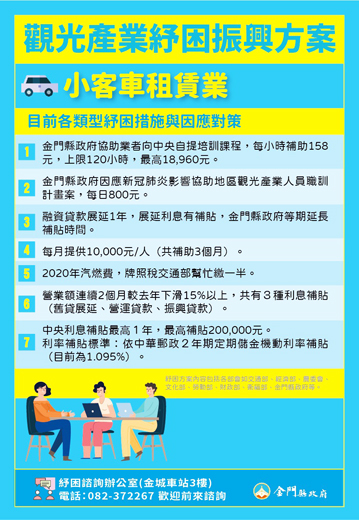 針對《小客車租賃業、貨運及海運業》紓困措施,縣府目前的作法包括: 小客車租賃業:地方以訓代賑計畫、等期加碼利息補貼;中央:培訓課程、薪資補助、汽燃費及牌照稅補貼、利息補貼。 貨運業:汽燃費及牌照稅補貼、利息補貼。 海運業者:免收碇泊費及垃圾清理費、薪資及利息補貼、補貼客運、貨運航線營運成本。 詳情可參閱金門縣政府全球資訊網「紓困振興專區」,也歡迎洽詢觀光處紓困諮詢辦公室(金城車站3樓)372267,縣府與您一起渡過難關。