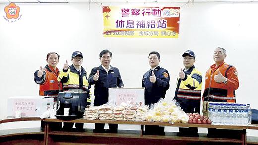 金門縣政府跨年夜在縣立體育館舉辦2017跨年晚會,吸引地區民眾超過千人前來共襄盛舉,參加民眾擠爆現場,連帶造成金城市區周邊交通車流量也形成極大壓力,金城分局為了維護用路人車安全,派出50名警力及結合協勤民力在路口執行交通疏導。不唯如此,縣警察局也首設專屬警方的「行動補給站」,現場提供麵包、熱食(粥、麵)、現煮咖啡、薑茶、水果等食物,除了讓輪替休息員警隨時取用,也讓前線執勤員警不再餓著肚子上崗。 更讓員警窩心的是,當日晚間縣警察局長許慶豐到休息補給站慰問時,還加碼帶來了一箱橘子慰勞執勤員警辛勞,金城民防中隊長楊肅謙知道警方在寒冬中辛苦執勤,也帶來一箱水果,地區85度C餐飲業者更提供一桶熱飲,讓第一線辛苦員警,隨時補充體力,為警方加油打氣。 一名即將屆齡退休翁姓員警表示,當了35年警察,站過超過百場的大型勤務,從來都是蹲坐在地上克難式的吃飯,輪替休息時有瓶水可以喝就已經是不錯了,現在警察局提供了多樣性的熱食能補充體力,覺得很窩心。 縣警察局長許慶豐表示,為了貫徹陳國恩署長體恤基層員警的政策,讓第一線執勤員警能在友善、有尊嚴的環境下用餐,並且有場所休息、調節體力,特別指示金城分局規劃於勤務地點設立「警察行動休息補給站」,並由警察局督察科輔導,未來有大型活動,也會視狀況比照來設立。