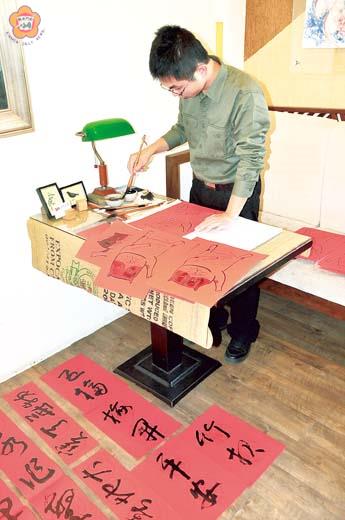 新年拿春聯!昨(1)日是106年元旦,金門花園咖啡店舉辦「新春開筆,金雞賀歲」春聯書寫贈送活動,由10位書法班名師成員,在現場揮毫寫春聯,免費贈送給在地鄉親,寫好的春聯鋪在金門花園咖啡店內的椅子、桌子、地板上,瞬時間整間店紅光煥發、喜氣洋洋,過年氣氛十足。 迎接丁酉金雞年,位在小徑的金門花園咖啡店昨日下午舉辦「新春開筆,金雞賀歲」春聯書寫贈送活動,邀請10位社區大學書法班成員,開筆揮毫書寫春聯,另外還有金門青年插畫家卡努,現場繪製「卡努」創意門神,供民眾索取。許多在地鄉親聽聞消息,紛紛來到現場領春聯,新的一年討個吉利、沾個喜氣。 這場活動由金門花園咖啡店店長洪篤欽主辦,他本身也是社區大學的書法班學員,104年年初時也曾經辦過一次,去(105)年因為忙碌而沒有續辦,今(106)年再恢復舉辦新年贈送春聯活動,邀請包括書法班名師洪明燦、蔡顯吉、鄭賀文、陳玉貞、黃秀中、陳月華、李麒麟、李明輝等人到場揮毫,洪篤欽表示,許多人都是歷屆書法班學員,功力都已自成一格。