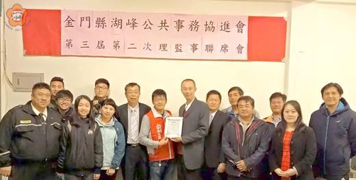 金門縣湖峰公共事務協進會召開第三屆第二次理監事聯席會會議,會長楊家聲盼該會結合各社團、公益團體及政府機關整合資源,從環保公益、弱勢族群、婦幼及新移民族群的關懷、產業輔導諮詢及民意代言服務等議題進行多元化的服務。 該協會假金門縣汽車貨運公會會議室舉行理監事聯席會會議,金門國際青年商會會長辛文盛也拜訪該協會,和會長楊家聲、理監事及會務幹部進行交流座談。 辛文盛讚許該協會積極投入地方公益服務的成果,殊值作為金門青商會等社團學習的「借鏡」,希望未來多多交流、合作,一起學習成長。辛文盛也特別敦聘該會總幹事賴盈璋博士為金門國際青年商會第24屆顧問。 會長楊家聲指出,湖峰公共事務協進會由創會會長楊萬山號召成立,由關懷鄉土負有社會服務熱情的人士組成,協會會員呈現多元,有宗親會、社區、同學會、公益社團的特色,許多會員來自各社團幹部,包括,中華民國關稅協會理事洪茂榮、董楊宗親會總幹事楊忠俊,社區發展協會總幹事馬自壯,貨運公會總幹事胡凱宇、烈嶼土角會館總幹事洪志偉等社團幹部。該團隊來自地區各鄉鎮,有著共通特色,就是憑著滿腔熱情,配合自己的專長,全心全意投入公益活動,為金門島嶼注入一股又一股的暖流。此次金門國際青商會特別敦請金門大學食品系賴盈璋教授擔任顧問,就是肯定賴盈璋博以學理及技術為基礎,利用智慧財產權的保護方式落實在島嶼發展高附加價值產業的用心。 楊家聲表示,該會宗旨在瞭解本地民眾需求,凝聚社區共識,推動公益活動,敦睦鄉親情誼。這幾年來秉持保護碧海藍天與金門大學觀光系、應英系、食品系與各公益團體結合慈湖淨灘,希望透過淨灘活動傳達環保愛地球的理念,讓更多年輕學子共同參與讓天空更藍、海水更靚,沙灘更亮眼。 在環保公益方面,將跨越鄉鎮界限,從海灘走向社區及護山淨山,以雙贏的思維達到公益環保及強身體健的目的。 在社會關懷方面,協會為使學生有實習的機會特別贊助學生實習製作全麥饅頭、麵包及醬油等產品,並將實習製作產品分贈至大同之家及弱勢家庭,今年中秋聯誼活動在金寧區舉行也特別邀請金寧消防、義消共同聯誼,以表達對消防弟兄守護地區的辛勞。 產業輔導諮詢方面,地區的產業命脈金門酒廠,協會總幹事賴盈璋引進台灣大學、嘉義大學及臺北醫學大學的學術研發力量致力於食品產業升級已有不少研究成果,從在地鹿茸產品升級、高粱酒糟在活性碳材的利用及黑蒜頭生理功能的訴求,以專利佈局的方式將技術留在金門為產業扎根;更積極推廣發展醬油產業希望能擴大就業市場,鼓勵青年學子返鄉奮鬥。協會將協助推動產業的角度,結合民意代表及有意願的業者,一起向縣府建言為金門產業提升盡一份心力。 楊家聲說:該協會繼續結合各公益社團共同搭起公益服務平台,讓公益服務相互交流、學習,讓專業得以分享、經驗得以傳承,未來也將藉由各機關團體、縣府單位、公益團體及學術資源的力量一起集思廣益,持續為金門盡一份心力,讓年輕朋友們的青春活力在公益服務上呈現。