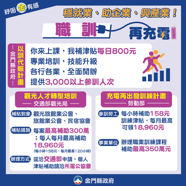 你來上課,我補津貼,縣府全面開辦各行各業培訓,提升從業人員技能,讓職涯更得心應手,核發每日800元職訓津貼,解燃眉之急。此外,也輔導爭取中央職訓計畫,地方中央1+1,職訓津貼1+1。 另外,中央部會紓困振興貸款,補貼利息6至12個月,期滿後,縣府加碼等期補貼利息。地方中央1+1,利息補貼1+1。詳情可參閱金門縣政府全球資訊網「紓困振興專區」,也歡迎洽詢社會處318823#62537、建設處316177、觀光處372267,讓縣府與您一起渡過難關。