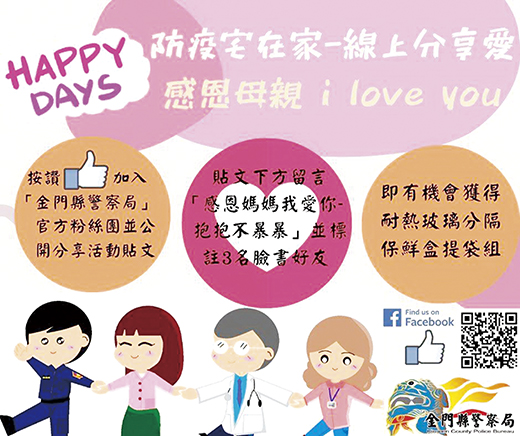金門縣警察局為關懷本縣婦女並呼籲民眾一同重視婦幼人身安全,特在母親節前夕舉辦母親節感恩母親網路抽獎活動,並於本(5)月10日線上抽出20名幸運中獎者公布於警察局臉書粉絲專頁貼文,各致贈「耐熱玻璃分隔保鮮盒提袋組」1組,縣警局希望藉由社群網站臉書Facebook傳播的力量,再次提醒家庭和樂的重要性,間接降低家庭暴力等婦幼事件發生的頻率。 縣警局指出,在本次活動將提供「耐熱玻璃分隔保鮮盒提袋組」20組「線上抽獎」,活動方式如下: (1)邀請民眾至該局官方臉書「金門縣警察局」粉絲專頁按「讚」並設定為「搶先看」。 (2)於金門縣警察局Facebook粉絲專頁張貼之「防疫宅在家 線上分享愛#感恩母親 I love You」活動貼文宣導頁面按「讚」,並於留言處留言「『感恩母親我愛你│抱抱不要暴暴』且標記3名好友!」。(範例:李小明、陳小花、王大頭,感恩母親我愛你│抱抱不要暴暴)。 (3)公開分享「感恩母親我愛你│抱抱不要暴暴」活動貼文於個人臉書粉絲專頁,完成以上3步驟,即獲抽獎資格。 本次活動將於本(5)月10日由「線上抽獎」系統抽出20名,中獎名單公布於警局臉書粉絲專頁貼文,不另行通知,中獎者請於3日內私訊相關資訊,並至縣警局少年警察隊領取。 縣警局局長張國雄希望藉由此次活動,宣導大眾共同營造婦女朋友尊重、安全與幸福的友善環境,並促使全民關心婦女安全議題!