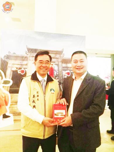 圖文/許加泰 曾來金門的明代兵部侍郎王忠孝的裔孫、泉州王忠孝文化論壇籌委會王志文(右)出席南明展,贈送《首屆王忠孝文化節》碟片予金門典藏,由副縣長吳成典代表接受。王志文也捐贈五萬元台幣作為金門宗族文化研究協會會務發展基金。 王志文是明代兵部侍郎王忠孝的第十三代裔孫,王志文說,在明末清初,不能忽略王忠孝在「反清復明」中的歷史功績,他輔助魯王,與鄭成功「一文一武」收復臺灣,是王氏的「開台始祖」,並在臺灣開荒農耕和傳播閩南文化,對臺灣的發展有歷史性的貢獻。 金門賢聚泰安宮(侍郎祠)供奉著兵部侍郎王大人(王忠孝),在太武山上「延平郡王奕棋處」還有遺跡,當時就是王忠孝與鄭成功在一起奕棋,現今在中國國家博物館還珍藏著這幅畫,還有「百字贊」等,2005年時連戰來訪時,特地展示出來並在中央電視臺新聞播出。王志文希望通過這次兩岸南明史蹟與家廟族譜交流展,能夠對兩岸友好交流和未來願景建立一個新的平臺並有著重要貢獻作用。
