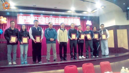 金門縣校外會日前召開「一○五年度年終工檢會暨校園安全座談會」,邀請縣內相關單位與會,共同針對校安問題所遭遇的困難與未來對策進行討論及謀求解決之道。會中,並頒獎表揚對全民國防教育有傑出貢獻的團體以及個人、與校長實彈射擊績優者。 金門縣學生校外生活輔導會「一○五年度年終工作檢討會」,於日前在盈春閣餐廳舉行,會議由教育部金門聯絡處督導張智芳主持,副縣長吳成典、金門縣政府教育處處長李文良、地區各級學校校長、校外會教官等人與會,共同參與議題的討論。 會議一開始,首先頒發一○五年度全民國防教育傑出貢獻團體獎,得獎的績優單位分別為:聯絡處、金門農工、金門高中、救國團。一○五年度全民國防教育傑出貢獻個人獎,獲獎者分別為:聯絡處教官劉穎德、聯絡處教官孫孝義、金門高中教官陳小蘋、金門農工教官宋洋孝、金門農工主任張皆欣、金門高中主任林偉倫等人。一○五年度全民國防教育校長實彈射擊競賽,得獎的校長分別為:特優, 西口國小校長蔡志隆;優等,金門農工校長劉湘金、金城國中校長許維民、金湖國中校長謝志偉、何浦國小校長曾秀玲;甲等,金門高中校長廖俊仁。 副縣長吳成典表示,教育工作是良心事業,是要經過潛移默化以及長期經營,才能得見成果的長期抗戰;校外會的存在正足以做為校內及校外、地方與中央的橋樑,這要仰賴各校訓輔人員的鼎力支持及協助才能功德圓滿。 督導張智芳也感謝地區教育人員及教官們一年來的辛勞與付出,他表示,教育從業人員都希望為青年學子創造一片純淨而能盡情揮灑的成長空間,他也希望今後大家能繼續落實推動各項輔導工作,塑造健康活潑的校園文化;以達成校園安全的目標。 對於未來的檢討與改進,校外會表示,在加強教育服務役男服勤管理方面,將賡續對教育服務役役男服勤及生活管理實施督(輔)導,使役男成為維護校園安全的積極助力。持續督促各校校安業務承辦人能經常上教育部校安中心網站點閱瀏覽最新訊息,尤其是颱風、地震等天然災害發生時,並依校安中心通報完成各項準備或回報各校校安狀況。持續協調檢警單位及社會資源,加強學生生活輔導、法治及交通安全教育,防止學生誤入歧途;並協請各校加強學生校外緊急服務暨假期安全教育宣導,以維學生假期安全。繼續推動「改善校園治安」及「春暉專案(推動紫錐花運動)」,加強親師生聯繫管道,以防範犯罪,維護校園安全。繼續與各校配合,在相關課程實施「守法、拒毒」、「毒禍2」及「戰毒紀」等反毒影片,加強反毒宣教,避免學生受到誘惑而誤入歧途。