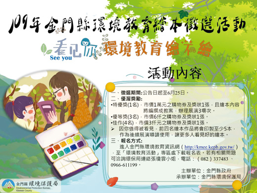109年金門縣環境教育繪本徵選活動即將開跑,環保局誠摯歡迎對繪畫有興趣的機關、團體、學校、社區或民眾來報名參加環境教育繪本徵選,盡情地用色彩將環境教育8大領域揮灑創作出來。報名日期至109年6月25日止,活動詳情及報名表格,可至金門縣環境教育資訊網/環境教育活動專區(http://kmee.kepb.gov.tw/)查詢,或洽活動聯絡人:張瓊雲小姐,電話:082-337483或0966611199。 想被看見繪畫天分的你,趕緊繪起來!金門縣環境教育繪本徵選活動歡迎對繪畫及對環境教育議題有興趣的人,快來繪一繪,用天馬行空或真人真事的創作方式,大膽的用色彩繪出你對家鄉土地的愛護,本次獎勵優渥,特優獎(1名),將可獲得市價1萬之購物券及獎狀1張,且因為你值得被看見,後續繪本內容也將編撰成教案辦理展演,讓更多人可以看見好的繪本。 環保局表示,本次繪本創作方式將結合金門在地特色與環境教育8大領域(學校及社會環境教育、氣候變遷、災害防救、自然保育、公害防治、環境及資源管理、文化保存、社區參與) 為主題,使繪本能啟發讀者關心自己家鄉土地並採取守護行動,珍惜家鄉土地的心,並能於日常生活當中實踐,以達到共同維護環境永續之目的。 為求徵選時能專業及公平性,於109年4月15日於環保局會議室,邀請專家學者(教育層面學者、美學設計學者、在地環境教育學者),辦理「環境教育繪本徵選辦法會議」共同商討界定繪本內涵及本次繪本徵選活動評分標準及活動辦法。