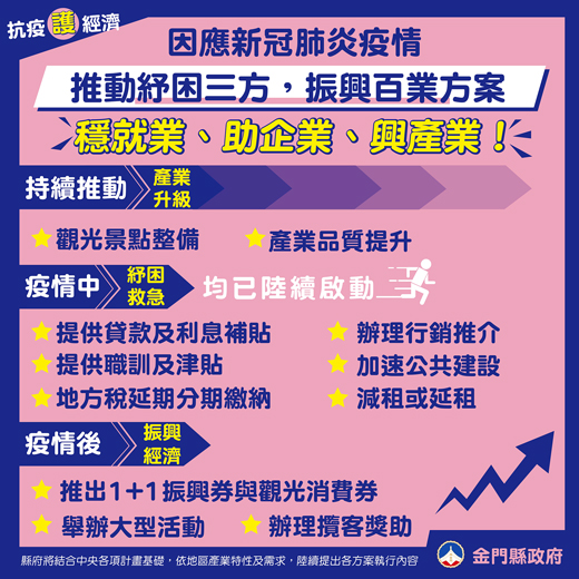 因應新冠肺炎疫情,縣府提出「紓困三方,振興百業」方案,各項措施已陸續推動,期能穩就業、助企業、興產業,與鄉親一起渡過景氣寒冬。後續縣府也將逐日說明各產業紓困及振興方案,受疫情影響之個人、業者或團體如有困難,歡迎洽詢金門縣政府產業紓困諮詢辦公室,縣府與您攜手共度疫情難關。