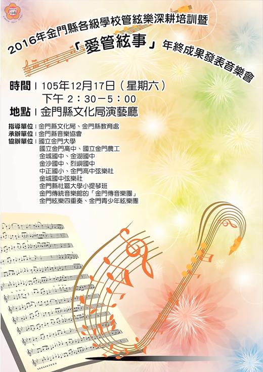 「愛管絃事」音樂會,12月17日下午2時30分起,假文化局演藝廳演出,由11個管弦樂團,以不同形式的組合方式呈現,分上下半場帶來許多經典曲目,也少不了電影配樂等,主辦單位表示,透過此次交流提供各校管弦樂團有交流觀摩的機會,也期待地區愛樂的朋友到場欣賞。 「愛管絃事」音樂會,為每年歲末年終各級學校音樂社團年度盛事,已經辦十幾年,今年將於12月17日下午2時30分起,假文化局演藝廳舉行。 「愛管絃事」音樂會,將由金門傳音樂團、青少年弦樂團、金門弦樂四重奏、中正國小管樂團、金湖國中管樂團、烈嶼國中管樂團、金門農工管樂團、金門大學管樂團、金城國中管樂團、金門高中管樂團等聯袂演出。