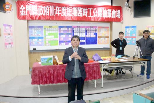縣府為協助本縣失業民眾就業,106年度賡續規劃短期就業計畫,提供三百個按日計酬短期臨時工工作機會,昨日在縣立體育場辦理公開抽籤,現場全程錄影,同時邀請縣府政風處、人事處等單位派員參與監督,過程公開、公平、公正,而錄取之短期臨時工名單將由縣府於十九日(下週一)統一公布,刊登於金門日報及金門縣政府網站。 縣府106年度短期臨時工公開抽籤作業昨日上午九時起在縣立體育場金城體育館籃球場與視聽室同步舉行,由社會處長甯國平主持、科長李文堆及社會處工作人員出席參加,縣府政風處、人事處代表出席監督。 甯國平處長指出,縣府為協助本縣失業民眾就業,106年度賡續規劃短期就業計畫,提供三百個按日計酬短期臨時工工作機會,共計有四百七十一人報名,包括一般身分三百二十八人、特定身分一百四十三人。 他也提到,鄉親除了參加縣府之臨時工抽籤外,亦可選擇私人企業之工作,若能適任的話,不但較為穩定且長久,更可累計工作年資及經驗,他也希望民眾不要過度依賴短期臨時工,鼓勵失業的民眾能早日投入一般就業職場。 昨日寒流來襲,報名參加抽籤的民眾親自出席的不如往年,抽籤時依各用人單位報名人數抽出錄取名額,為避免民眾過度依賴政府部門之工作機會,備取員額為正取員額的三分之一,以杜絕未中籤者期待心理,希望他們可以投入民間企業職場,以免影響企業職場用人。至於未到場者,是由參與監督的縣府政風處、人事處代表代為抽籤。 縣府社會處指出,這項按日計酬短期臨時工,除針對一般失業者勞工提供就業機會外,並保障弱勢族群(如身心障礙者、低收入戶…等)之就業權益。同時,為應業務實需暨獎勵績優人員留任,其中四十五名以遴選方式進用,餘二百五十五名受理公開登記抽籤,其中弱勢族群33.33%(簡稱特定身分,包括:身心障礙者、低收入戶、更生受保護人或毒癮個案、家庭暴力及專案受保護婦女、兩年內曾遭受職業災害而失業勞工)、一般失業民眾66.67%(簡稱一般身分)。 社會處表示,本次錄取之短期臨時工名單將於十九日統一公布,刊登於金門日報及金門縣政府網站。另,本計畫臨時工正式上工日自明(106)年一月四日至明(106)年十二月三十一日止;每月工作日以二十二天為限,採按日計酬,不支固定薪,每日津貼為八百七十七元。而本計畫之臨時工於到工當日即應參加勞工保險及全民健康保險,進用期間與用人機關屬公法救助關係,概不適用勞動基準法。