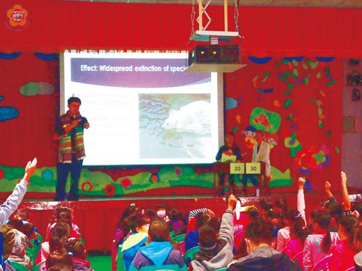 古城國小每周五晨間「英語綜合活動」時光,昨日上午中籍英師陳威廷(Jimmy)、美籍英師(Elyse)及金大應用英語系實習生(Bolin)三人,透過英文短劇、簡報,以英語對話方式引導全校學生討論「地球暖化」(global warming)議題,以關鍵英文單字、簡易的例句,透過有獎徵答互動及討論等方式,傳遞正視地球暖化的影響以及學習思考如何減緩溫室氣體的產生。 昨日登場的周五晨間「英語綜合活動」時光,古城國小中籍英師陳威廷(Jimmy)、美籍英師(Elyse)及金大應用英語系實習生(Bolin),將全球暖化議題融人教學中,三人以英文短劇以及簡報方式,透過英語對話引導全校學生一同學習及討論「地球暖化」(global warming),並思考地球暖化對大家生帶來的影響及如何因應。 過程中,三位老師透過英語教學將地球暖化的這項受到國際重視的環境課題傳遞給古城學童。在「地球暖化」(global warming) 小短劇,確切的傳達對於地球暖化正視的想法,並將內容以關鍵英文單字、簡易的例句,及有獎徵答的互動及討論等方式,引導學生學習思考,關注氣候改變的步調與型態。以及身為地球環境中的一分子,對於氣候變遷造成的風險該提高警覺,並思考如何適應未來的氣候,對於可能遭遇的危害該如何因應。而提出問題很容易,尋求因應氣候變遷的調適策略卻非常困難,需要生活在地球上的每個人自我要求節能減碳做起。 古城國小校長楊成業表示,這是一次非常成功的英語教學融入環境教育議題活動,學校英語教學團隊的精心策劃與引導,讓學生既能學習到有關「地球暖化」(global warming)常見的關鍵英文單字及例句,並引導學生一起正視、共同關心地球暖化的議題,並透過對話與討論,讓學生認知我們只有一個地球,大家要一起努力,每個人從自己做起,並喚起周邊身旁的家人及朋友,共同從日常生活中力行節能、減碳、減廢,救救我們的地球,也希望每個人都能從生活中力行,我們的地球可以減緩暖化的現象,進而達到永續存在與發展。