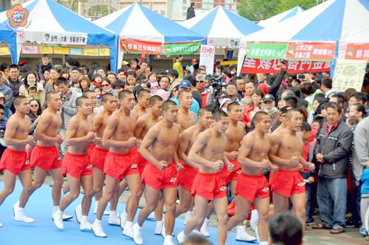 李增汪/圖文 蛙人操表演,吸睛! 金門家扶中心昨天舉辦的冬暖愛心園遊會,安排兩棲蛙人操表演,蛙人健壯體格,以及不畏天冷和精神抖擻的演出,成了會場最受矚目的焦點。
