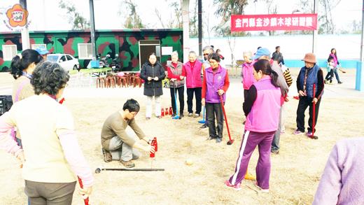 碧山靶場揮杆樂!木球研習營快樂開訓!金沙鎮公所鎮為推展運動風氣、豐富老人生活!與金門大學運動休閒系開辦的木球研習營活動,學員們前進碧山歸零靶場研習木球課程,學習各種木球攻防技巧,金沙鎮秘書許萬恭還帶飲料前往現場為學員們加油打氣,希望老人家們活到老、學到老、動到老,健康運動吃百二! 金門地區木球運動在國內各項賽事的成績有目共睹,此次報名木球研習營的學員格外踴躍,吸引數十位學員報名參加,金沙鎮公所為了讓學員們能精進球技,特別邀請到選手出身金門大學運動管理系副教授林本源擔任講師,並由木球隊人員擔任專業教練,為學員們解說各項木球運動的要領。 在訓練課程中,教練除對學員教學著重個人動作調整、規則說明、比賽戰術及比賽經驗分享。對初學者則以教導個人基本擊球技能,課目如發球、攻門、修正等各項動作教學,同時練習個人組小賽事,學員們可說是收穫滿行囊! 金沙鎮公所秘書許萬恭表示,特別感謝金門大學運動休閒系的力挺,並期勉老學員們能在研習營中培養運動興趣,多加練習、精進球技,促進自我的身體健康。而此次的研習活動不但活化碧山歸零靶場草地,推廣適合全家大小共同參與的木球運動,並藉由活動將已走入歷史的靶場再次帶入民眾的生活,喚起民眾的回憶,還能充分利用及活化場地。 金沙鎮公所指出,該研習活動分上、下午兩梯次,上午為個人組,下午則是親子組,上午個人組吸引了相當多的長輩來參與,長輩們甚至比年輕的學子還要認真學習,研習過程歡樂十足、場面溫馨。