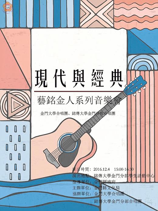 又到年尾了!「第二屆藝銘金人歲末音樂會」活動,將於十二月四日(星期天)下午三時到四時三十分,假銘傳大學金門分部學生活動中心開唱,由舉辦單位「金銘合唱團」以現代與經典為主題進行表演,並展現團員唱歌功底,更誠摯邀鄉親和喜愛音樂人士到場聆賞,共享一場盛大的美妙聽覺盛宴! 「金銘合唱團」是銘傳大學金門分部與金門大學合作成立的一個社團,成立三年以來一直勤於訓練,並不斷嘗試挑戰時下最流行的歌曲,與時俱進。今年的「第二屆藝銘金人歲末音樂會」,主要是為檢驗合唱團成員的歌唱技巧,給予一個發揮所長與得到肯定的舞台。 在「第二屆藝銘金人歲末音樂會」中,「金銘合唱團」不僅表演時下傳唱度高的歌曲,如因Me Before You電影大熱的主題曲photograph,榮獲第40屆格萊美獎的I believe I can fly,也有流行於樂壇經久不衰的經典名曲you rise me up等。這些歌曲,將通過金銘合唱團的用心表演,將會讓聽眾充分感受現代與經典的完美契合。 銘傳大學合唱團成立於中華民國104年3月16日主要成員來自中國大陸、馬來西亞等地。為讓學生融入金門地區的文化以及讓熱愛歌唱的學子有一個社團活動,所以積極的展演 和多方面歌曲的嘗試,與金門大學合唱團合作、交流。達到多元 文化的層次。 金門大學合唱團成立於中華民國102年3月11日,成立的宗旨是為了提供愛唱歌的同學學習歌唱技巧的管道,與表演舞台;並藉由歌唱的學習與表演更融入金門當地。 同時金門大學合唱團的成立也完整了金門的合唱體系。除每年參加地方的合唱觀摩深受好評外,也積極參與了各項的音樂表演活動,讓地區提升音樂素質。