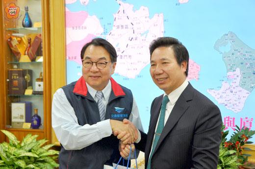 交通部航港局長謝謂君昨日上午拜會金門縣長陳福海,感謝縣府通力合作,完成港泰台州輪拖離作業,降低海洋生態及環境衝擊。 謝謂君昨日上午前往金門縣政府拜會縣長陳福海,陳縣長以金門長期扮演兩岸和平交流角色,是期蔡英文總統以開放金門的政策,鏈接政府南向政策。而航港局對於航港業務,如小三通票價、航權、航班等,可以和金門港務處先討論,能充份授權地方的就充份授權地方。 謝謂君是於昨日上午九時五十分許,率員拜會縣長陳福海,縣長辦公室主任陳永明、行政處長傅豫東在場作陪。 陳縣長也以自己研究金門二十八年,暢談和分享金門故事讓航港局長謝謂君等了解金門。他指出,金門自宋朝以降到明清,出過五十位進士,比台灣的三十三位進士還多,其中,開台和開澎進士都是金門人。而金門目前有產生的中、少將就有六十二位之多(十位中將、五十二位少將),可說人才輩出。 陳縣長也對於航港局在這次處理大陸籍港泰台州貨輪因颱風漂移擱淺古崗海岸的過程,和地方政府共同用心,以及在水頭旅運中心的幫忙很多,還有謝局長在觀光局任內對金門的幫忙,表達感謝之意。 謝謂君則強調,金門有好的夢想,會儘量幫忙實現。而兩岸海上搜救演練則認為應繼續辦理,並基於人道救援立場,千萬不能因政治因素而停掉。對於小三通金門需要有好的門面,旅運中心的興建航港局會全力幫忙,並樂見小三通船舶越來越新,品質愈來愈高。 「港泰台州」輪自9月15日遭颱風莫蘭蒂擱淺在金門古崗後,縣長陳福海立即指派有處理擱淺船隻經驗的行政處長傅豫東為緊急應變小組現場指揮官,統籌現場搶救任務。期間,陳縣長更去電協調廈門海事局派遣2艘油船到金門抽除船上殘油,在環保局及各界的通力合作下,直到9月23日岸際污染及殘油處理告一段落後,才交由航港局進行拖離作業。 航港局密集召開38次應變會議,期間還經歷颱風梅姬、海馬及東北季風等不利因素影響,造成船體多處破損,增添拖救困難度,所幸最後在各機關群策群力合作,以及金門民眾監督下,終於在11月16日拖離金門海域。