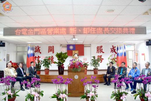 台灣電力公司金門區營業處昨日舉行新、卸任處長交接典禮,卸任處長王仁炳榮調台電基隆區營業處處長、新任處長由台電總公司配電處副處長楊崇和調任。應邀觀禮的金門縣長陳福海、副議長謝東龍、以及監交人王耀庭期許台電團隊持續落實全島電線地下化建設、「強化配電線路防災韌性計畫」,建置饋線自動化系統等電力建設,提供金門民眾更好的供電服務。 交接典禮於昨日上午九時舉行,在台電總公司配電處處長王耀庭監交下,楊崇和由王仁炳手中接下印信,並宣誓就任金門區營業處處長。金門縣長陳福海、副議長謝東龍、金城鎮長石兆瑉、議會秘書長李增財、立委楊鎮浯服務處主任孫國智、福建省電氣公會理事長吳增允、台電塔山電廠廠長陳文寬等來賓以及金門區處員工在場觀禮。 縣長陳福海很稱讚王仁炳的才幹,領導團隊努力的績效,升任台電基隆區處處長,是「金門之光」。陳縣長還特別頒贈「功在金門」的紀念牌,表彰王仁炳在金門服務近五年的服務貢獻,台電團隊過去5年來對金門穩定供電。 陳縣長也歡迎楊崇和從台電總公司調任金門服務,代表台電看重金門電力發展前景,器重楊崇和的能力,期待楊崇和「為金門多做一點事」,達成總公司賦予的責任和任務,讓中央看到楊崇和的努力成果,將來楊崇和再調回台灣後一定高升。 陳縣長說,「危機就是轉機」,強颱莫蘭蒂重創金門,行政院長和台電董事長來金勘災,也看到了金門電力饋線系統嚴重受損的災情,了解金門電力上的問題,正視加速推動金門全島電線地下化建設的需求。陳縣長特別感謝台電團隊在這一次莫蘭蒂風災不眠不休救災的辛苦,也展現軍民同島一命,不分彼此共同救災的情感。 陳縣長說,破壞也是建設的開始,王仁炳任內推動「強化配電線路防災韌性計畫」,希望楊崇和上任後,要無縫接軌這項計畫,推動時不會有落差。 陳縣長指出,金門有發展的條件,在電力建設上,金門先把自給做好,未來可能發展離岸發電或是大陸接電,成為兩岸民生交流的議題;期盼台電可推出可長可久的電力建設,讓金門未來不會缺電。 副議長謝東龍也再提八十八年的丹恩颱風、以及今年九月的莫蘭蒂颱風,都重創金門的電力系統,台電團隊在這一次風災的搶修高效率,縮短了停電的時間,陸續恢復全島供電,減輕風災期間所帶給軍民不便的生活。謝東龍對王仁炳的督導防颱及搶修得宜,大加推崇。 副議長謝東龍也代表議長洪麗萍贈送紀念瓷瓶予王仁炳,盼繼續為金門電力建設做出更多貢獻。 監交人王耀庭稱讚即將榮任基隆區處處長的王仁炳,於101年1月1日調任金門區處處長,工作負責盡職,自我期許甚高,常常不分晝夜犧牲奉獻,帶領團隊全力以赴,圓滿達成公私交付的任務,尤其是莫蘭蒂颱風的搶修,在金門縣政府等單位的協助下,能在最短時間內完成恢復供電。 王耀庭也稱讚新任處長楊崇和,任事積極認真,勇於承擔責任,歷任業務處主管績效評估、主管硬體、配電自動化系統專業工程師、北市區處副處長等職務,具備配電工程、饋線自動化等豐富實務及管理經驗,電務工作歷練十分完整,相信以他過去豐富的經驗,領導金門團隊一定會有更優異的表現。 王仁炳說,回家鄉金門服務近5年,十分感恩地方的愛護,更要感謝陳縣長大力支持台電各項業務及建設,尤其是莫蘭蒂風災的救災工作,陳縣長更是站在第一線協助台電人員執行搶修作業,提高救災的效率,在最短的時間內完成復電。 楊崇和表示,台電公司有不少金門子弟,他們展現堅忍不拔的毅力,讓他印象深刻。楊崇和勉勵團隊落實台電「誠信、關懷、服務、成長」的經營理念,維持良好的工安紀律、確保各項電力建設的施工品質,提供用戶最貼切的服務。此外,他也提出未來的業務重點工作,包括,如期、如質推動3年的「強化配電線路防災韌性計畫」,預定108年商轉;建置饋線自化系統,在災難事故發生時,可以縮短停電的時間,提供金門地區民眾更好的服務,也提供更優質的供電品質。
