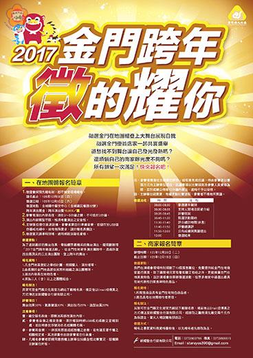 今年2016跨2017年,金門跨年取20「17」與「一起」諧音發想主題為「2017金愛在一起」,訂於12月31日晚間登場,並進行在地表演團體以及在地優質商家徵選,將評選出前三個團隊於跨年舞台上演出;以及徵選十組特色商家於跨年晚會現場免費擺設攤位,一起倒數迎新年。 「2017金愛在一起」跨年晚會將於12月31日登場,文化局訂於12月10日(六)上午8時30分,假金城國中藝文中心舉辦「2017金門跨年徵的耀你」在地表演團體徵選,將錄取前三名團隊,於跨年舞台上表演,並且還有萬元演出獎金獎勵。即日起至105年12月8日(四)下午6時止受理報名,有意角逐之在地表演團體及活動評選方式,請至金門縣文化局網站下載報名表格,填妥報名資料後,以 email 或傳真方式傳送到承辦單位新耀整合行銷有限公司。07-3903765,傳真,07-3806919,Emil:stareyes390@gmail.com。 另外,文化局也表示,「2017金愛在一起」,同時亦有台語諧音「很愛做伙」的意涵。為了讓在地優質商家能共同參予,2017年跨年晚會也徵選十組在地優質特色商家,即日起至(105)年12月15日(四)受理報名,以書面資料審核,以先報名者優先錄取,將於(105)年12月20日(二)公佈錄取名單。也希望透過遴選出最具在地代表性的美食與特色商品,提供前來參加跨年晚會的遊客們最優質的在地商品,推廣金門當地特色,相關徵選詳情,請上網金門縣文化局網站查詢,網址為http://www.kmccc.edu.tw/mp.asp?mp=1,並以傳真及EMAIL報名。 「2017金門跨年徵的耀你」在地表演團體以及特色商家徵選,即日起受理,有意角逐者請至文化局網站下載報名表或詳查徵選規定,並於規定時間內報名,若有疑問請洽07-3903765,傳真,07-3806919,Emil:stareyes390@gmail.com。