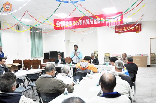 金寧鄉公所舉辦105年度村鄰長基層幹部座談會,首場昨晚巡抵古寧村辦公處,金寧鄉長陳成勇率領鄉公所各課室主管列席與會,聽取來自基層的心聲和對鄉務建設發展的興革建議,陳成勇表示所有的建議,是鄉公所權責的均會妥善處理和改善,非權責的將轉呈相關單位參處,並追蹤處理時程,給村鄰長一個滿意的答覆。 金寧鄉公所辦理「村鄰長基層幹部座談會」昨日晚間七時在古寧村辦公處舉行,由古寧村長李朝金主持,金寧鄉長陳成勇率領鄉公所秘書陳清寶、各課室主管列席與會,金管處和金寧代表會副主席李開陣、代表李正騰及調解會主席李國平與委員也到場聽取來自最基層的心聲與建言。 鄉長陳成勇除報告歷年來公所各課室執行工作成果,讓鄰長了解公所近年來所執行的建設與服務項目。並表示鄉公所每一年都會辦理基層幹部座談會,就是透由和這些基層服務「尖兵」的座談,更了解民眾最關心的問題,適時的檢討,也向上級單位反映,來為民眾服務,解決民需問題。 座談會中,與會鄰長提出建言包括有鄰長參訪觀摩、鄉村水溝整建、農業產業道路建設、社區綠美化工作、垃圾不落地、環境衛生的整理等等問題。 鄉公所指出,這次舉辦村、鄰長基層幹部座談會行程,首場昨晚在古寧村辦公處召開;第二場定於今(廿四)日在安美村辦公處舉行;廿八日在盤山村辦公處;廿九日在湖埔村辦公處;三十日在榜林村辦公處;十二月一日在后盤村辦公處,各場次座談會的時間都在晚間七時舉行。