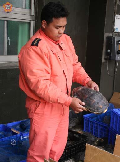 海巡署第十二巡防區金門海巡隊,昨日凌晨查獲大批由台灣走私至大陸的烏龜以及鱉蛋,其中有一隻疑似為保育類動物柴棺龜。金門海巡隊表示,已將兩名涉案的廈門漁民依違反國家安全法等罪嫌移送金門地檢署偵辦,若柴棺龜經送鑑定屬實,另要吃上違反野生動物保育法的刑責。 海巡署第十二巡防區金門海巡隊,昨日凌晨在西園外海一海里處,截獲地下小三通的大陸舢舨,發現船上載有將走私到大陸的鱉蛋六萬三千粒、烏龜二百七十四隻,數量為近幾年之冠,其中還有一隻疑似保育類野生動物的柴棺龜,金門海巡隊表示,已將兩名涉案的廈門漁民,移送金門地檢署偵辦。 金門海巡隊也指出,昨日凌晨二時三十分許,接獲巡防區統合中心通報,在金門北海岸西園外海海域發現有可疑船隻從事非法行為,當時正在該海域執勤的PP-2027巡防艇獲報後即趕往查緝。 巡防艇長莊國俊帶領執勤人員登上,約於西園外海一海里處的無名舢舨執行安檢,發現船艙內載有十五個紙箱的鱉蛋和大批塑膠網裝的活體烏龜,並緝獲郭姓船長等二人,該批走私物品不但其數量多為歷年之冠,其中有疑似保育類動物亦為歷年少見,連人帶船押回料羅港偵訊。 金門海巡隊表示,經過清點,鱉蛋總共約六萬三千粒、總重三百三十公斤;烏龜則是二百七十四隻,重達三百公斤,數量是近幾年之冠。烏龜大多數為斑龜、巴西龜等,其中有一隻疑似保育類野生動物的柴棺龜。 縣府建設局接獲海巡隊通報,由漁牧課員陳宗正趕往處理。陳宗正表示,鱉蛋將移到金門縣動植物防疫檢疫所銷燬,至於烏龜研判也是來自台灣,將報請行政院農業委員會裁定如何處理。 金門海巡隊長翁欣祺表示,截獲的鱉蛋和烏龜是要從台灣走私送到對岸供台商養殖或食用。 金門海巡隊表示,四年前曾查獲烏龜六箱二百一十公斤走私中轉案,此後即消聲匿跡,為何又成為走私品項,還要深入調查。 海巡隊也表示,據涉案的廈門漁民表示,他們是受雇以一趟一百元人民幣的代價,到西園外海以兩艘保麗龍舢舨將貨載到船上,運回大陸,沒想到在要離開時還是被抓了。 金門海巡隊也表示,已將兩名涉案的廈門漁民依違反國家安全法等罪嫌移送金門地檢署偵辦,若柴棺龜經送鑑定屬實,另要吃上違反野生動物保育法的刑責。 金門海巡隊也指出,「安海專案」期間將加強取締金門地區非法越界進入禁、限制水域捕漁之大陸漁船,有效打擊走私、偷渡等犯罪,並防止禽流感等疫病及黑心食品入侵。呼籲大陸方面應有效約束其漁民禁止越界侵入我方水域,避免以身試法,影響兩岸和諧及傷害雙方漁民權益。 金門海巡隊也籲請民眾,若發現有任何非法走私等情事,請播打118免費報案專線向巡防區通報,巡防區將立即前往處理,希望大家共同為維護我方漁業資源及海域安全盡一份心力。