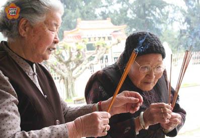 老吾老以及人之老! 她老?她比她更老!她七十九歲;她九十六歲。 農曆每個月的十六號,在中蘭的象山金剛寺都有消災法會。昨天是十六,又有很多祖母級或曾祖母級的老婆婆、老太太們,都聚到這裡燒香拜佛,祈求闔家平安,東南西北,不論往那個方向都好! 在這裡,老人家們笑口常開,閒話家常。金湖鎮成功里里長陳國強的母親莊含鸞今年七十九歲,年紀已經不小,不過卻時時扶持另一位九十六歲的阿婆。九旬多的阿婆身子略駝,燒香拜拜卻有一種自然的韻律。莊含鸞誇她很會拜,拜得很好看。 老人家拜拜,真的很好看,而且好像是越老越好看!