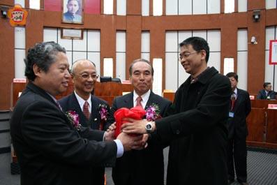 金門縣議會第四屆新科縣議員十八人昨日上午宣誓就職,正式展開為期四年的為民喉舌任務,並在平和順利的過程中選舉正副議長,由謝宜璋與許玉昭分別當選正、副議長,不少人盛讚這是兩性共治在金門最高民主殿堂作了最佳的示範。 縣議會第四屆議員宣誓就職典禮是於昨日上午九時正式舉行,縣議員當選人許玉昭在八時二十分左右完成報到手續,拔得頭籌,隨後新任縣議員也陸續完成報到,金門地方法院法官林鈺琅到場監誓。 宣誓就職典禮從上午九時許展開,縣議員當選人首先互相推舉蔡水游為宣誓就職的主持人,稍後王再生榮膺正副議長選舉、宣誓的主持人,全體新科議員在林鈺琅監誓下高舉右手宣讀誓詞,並在誓詞上簽章,完成宣誓,林鈺琅也當場報告完成宣布十八位議員,正式行使第四屆縣議員職權。 包括縣長李炷烽、福建省政府省主席顏忠誠、秘書長翁明志、縣府副縣長楊忠全、主任秘書翁廷為與地方各界首長到場觀禮。此外,檢警調也出動龐大陣仗全程到場蒐證錄影,加上部分議員的支持者,讓整個典禮顯得更為熱鬧。 稍後十時起展開第四屆縣議會新任龍頭選舉,王再生首先報告出席人數及本屆正副議長選舉投票方法,議員並互推謝宜璋、洪允典與楊永立為監察員,展開投開票作業。 在第一輪投票中,剛開始形成謝宜璋與陳玉珍兩人的票數拉鋸戰,謝一票、陳一票之聲,頻頻響起,現場的氣氛頓時相當緊張,結果連任三屆議員的謝宜璋得九票,陳玉珍得八票,前議長莊良時得一票,謝宜璋雖然獲得最高票,但因得票未過半數,依規定必須進行第二輪投票。 在第二輪投票中,謝宜璋還是穩穩掌握九票,反倒是陳玉珍僅得六票,莊良時還是一票,另外有兩張廢票,結果是由謝宜璋以最高票,當選為縣議會新任議長,會場隨即響起掌聲道賀,謝宜璋也立即向在場的議員握手表示感謝。 至於副議長選舉,則較為快速,一次就搞定,在第一輪投票中,也是連任三屆議員、並曾任第二屆副議長的許玉昭,拿下過半數的十票當選「重作馮婦」,另一位競爭者許建中則得到八票。 在休息十分鐘後,也立即進行議長、副議長的宣誓就職,在內政部參事黃松棋的監誓下,謝宜璋和許玉昭兩人宣誓就職,謝宜璋由前議長莊良時手中接過印信,宣告第四屆金門縣議會成立,他表示,將誠心誠意與議員同仁攜手合作,敦促縣府戮力以赴,進而開創金門更大發展的格局與空間,以造福全體縣民。 對於正副議長在平和理性下,順利完成選舉,黃松棋也極表稱許,他說,地方自治是民主的基石,希望議員在享受榮譽之時,亦應恪遵法令,善盡監督責任,達到「弊絕風清、廉能政府」的施政目標,推展問政理念,樹立民主風範。 整個宣誓就職典禮暨正副議長選舉在莊嚴隆重、平和理性過程中,順利在十一時三十分許,圓滿告一段落。