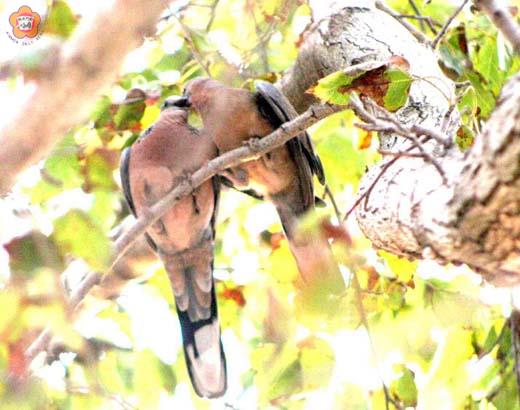 在天比翼,同枝為侶。交頸而憩,情愛之旅。 述美國小楓香林道的楓香樹上,一對鴿子正在談情說愛。原來,不只是人類中的情侶才會耳鬢交接,鴿子也會耳鬢廝磨。